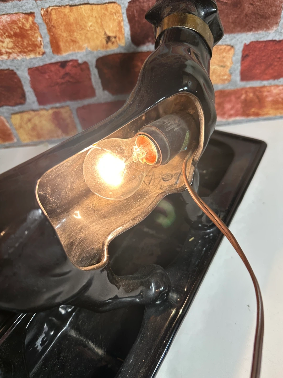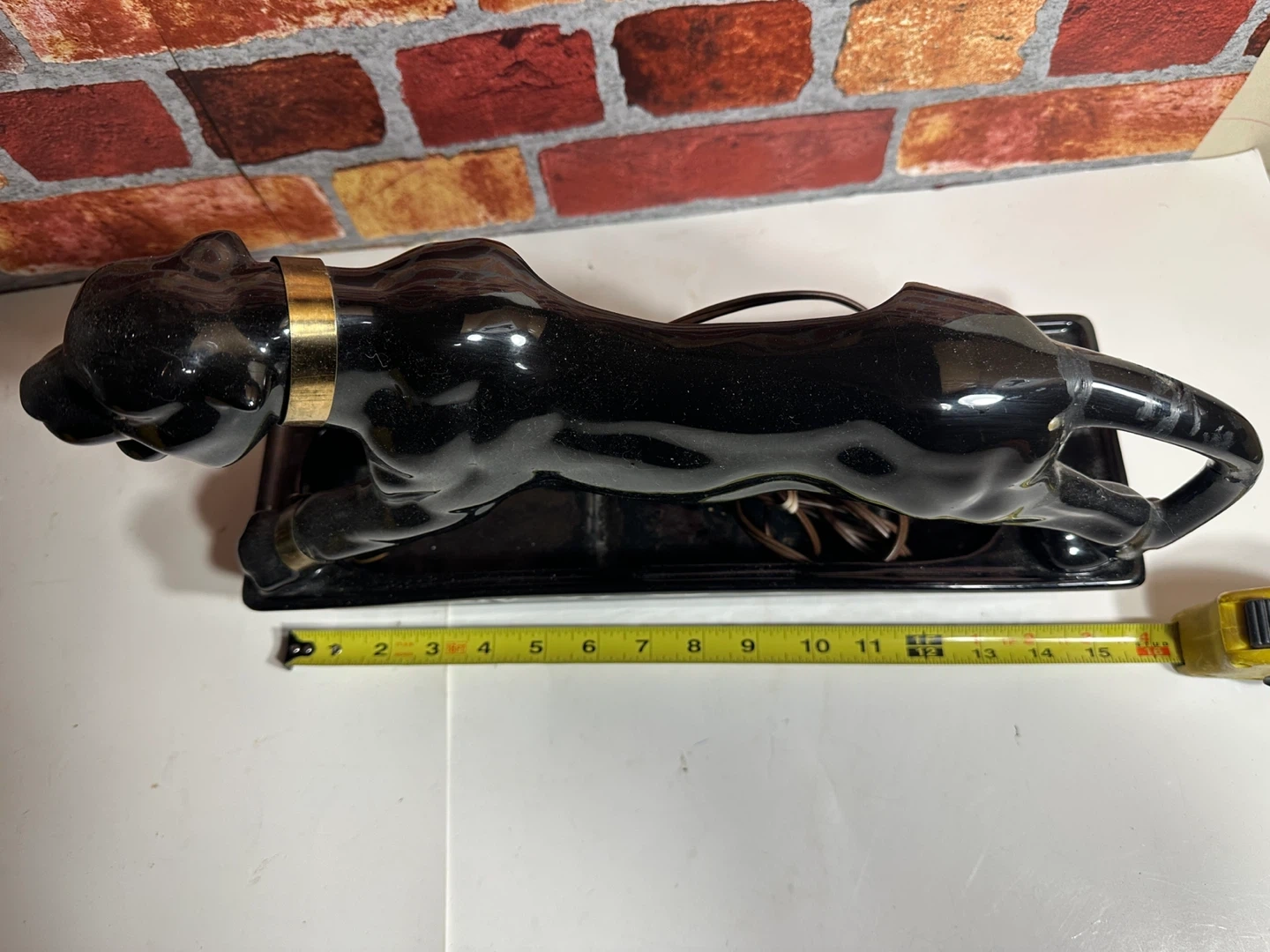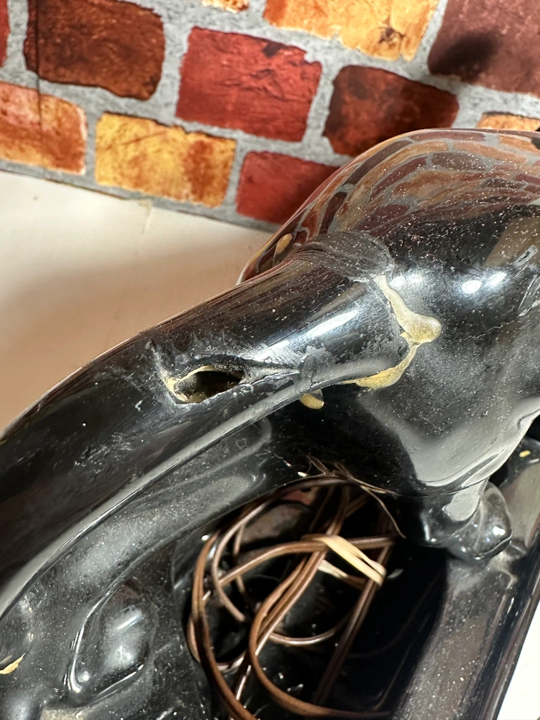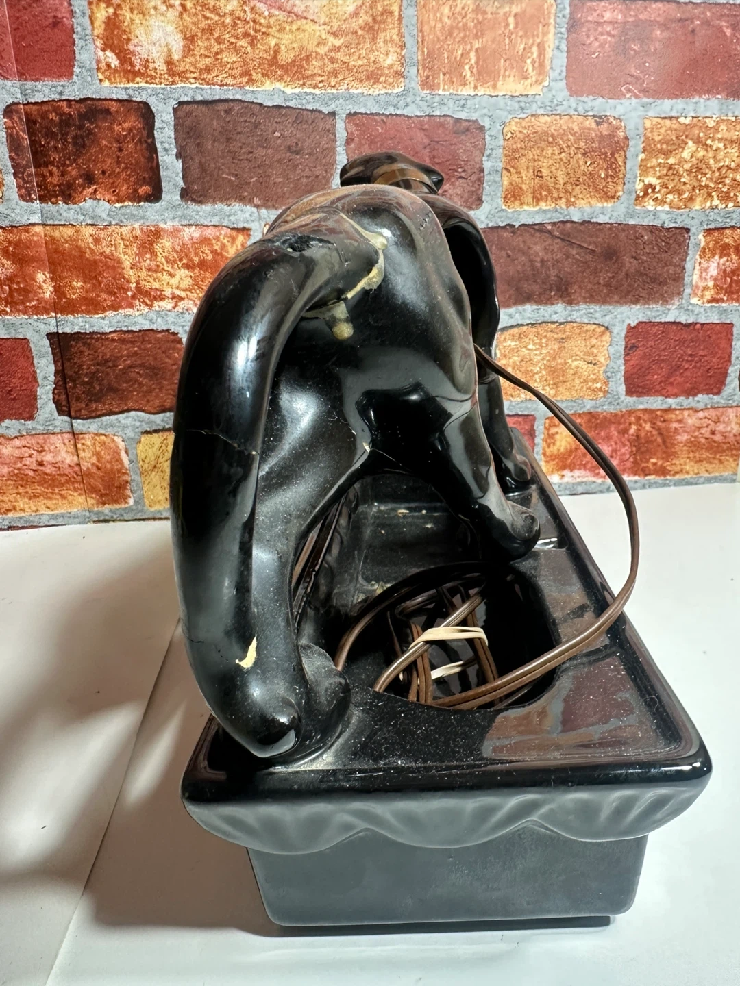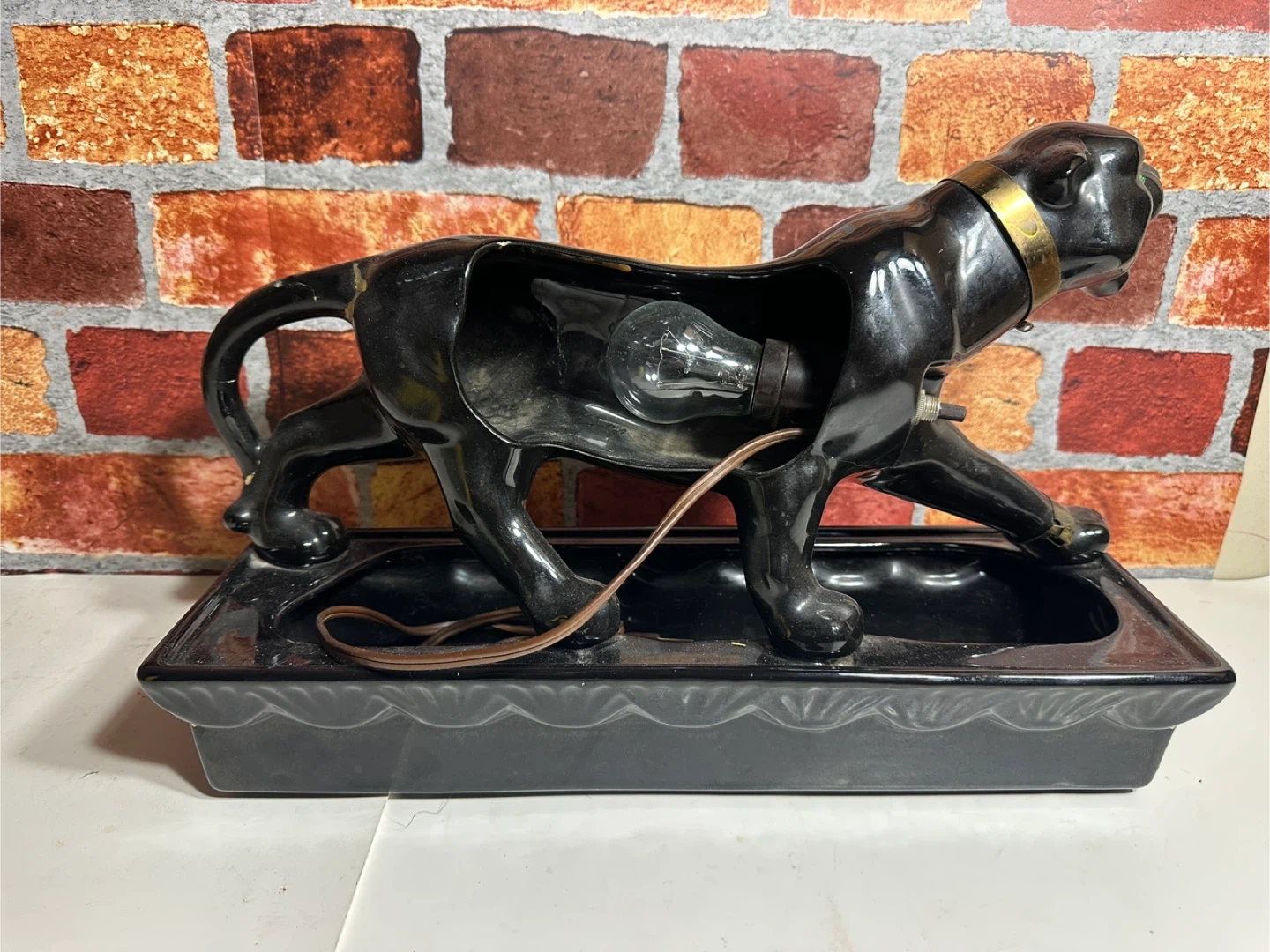 This black ceramic panther lamp features striking green gemstone eyes and a gold collar accent. It's a unique statement piece that adds a touch of retro flair to any room. The lamp includes a light bulb and cord. there has been some repair, but it’s still a cool piece.