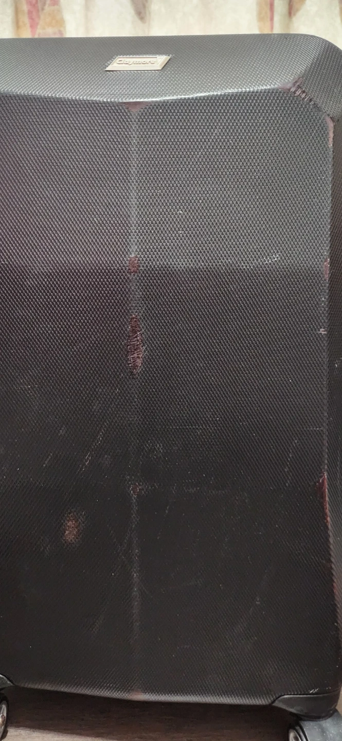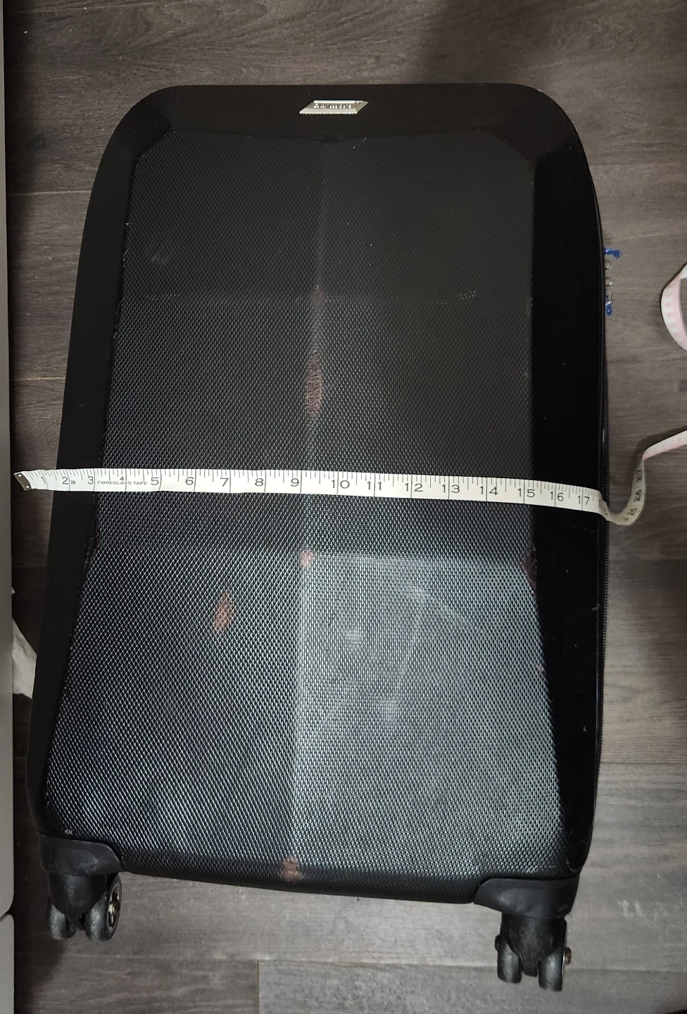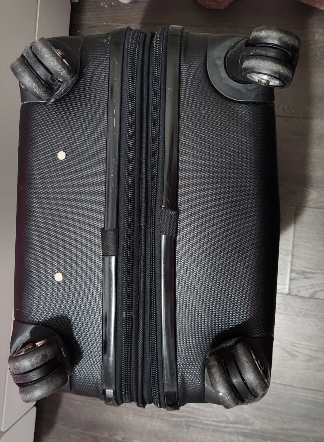 This is a black hard-shell spinner suitcase. It features a textured exterior and a zip-around closure. The suitcase has a telescopic handle and four spinner wheels for easy manoeuvrability. The main compartment expands for extra packing space. It is 27 cm tall. Great for weekend getaways or longer trips! The zippers are missing but replaced with blue pins that work the same way.