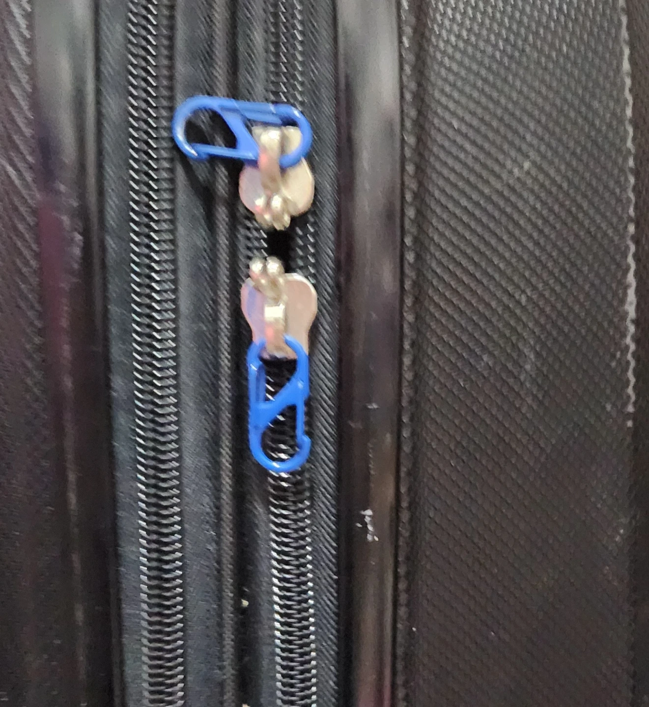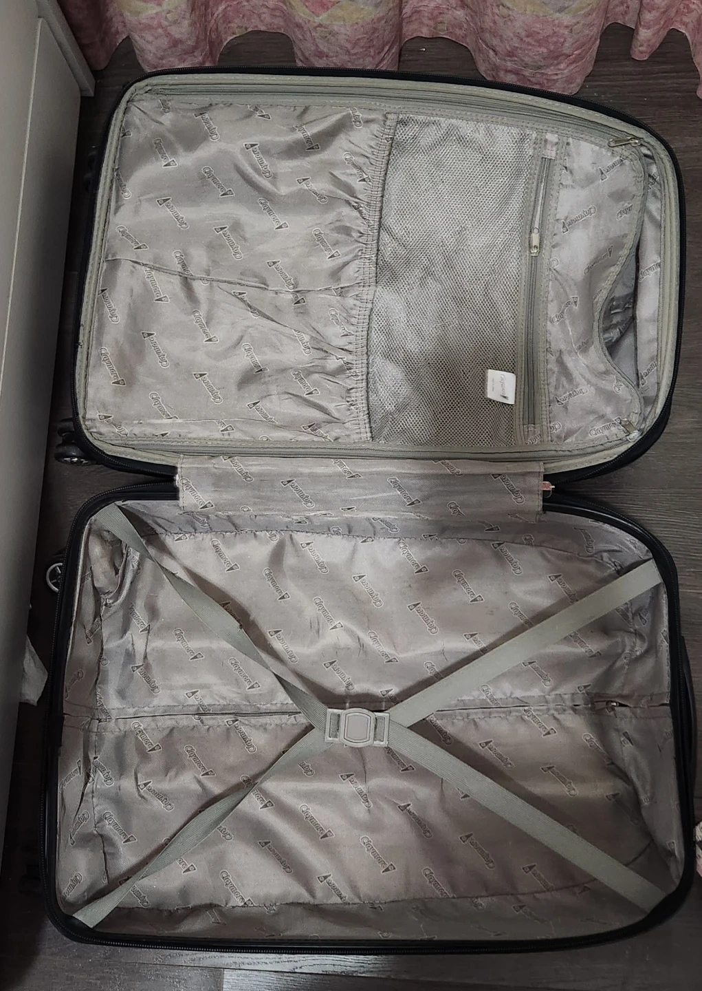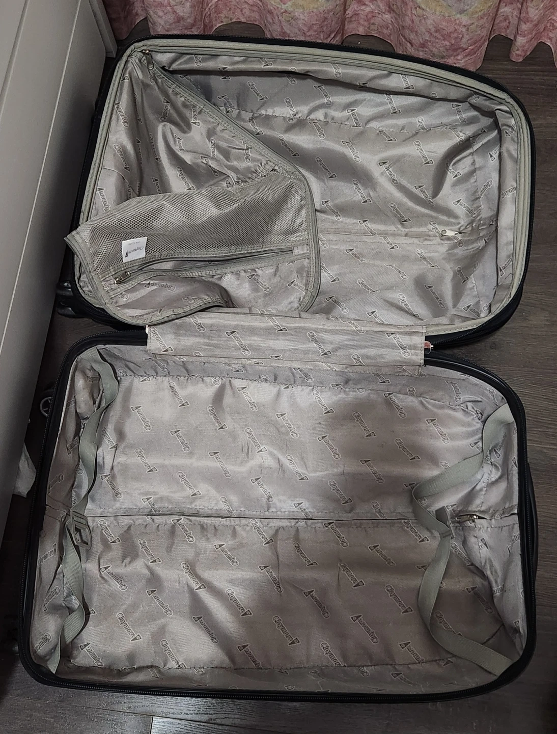 This is a black hard-shell spinner suitcase. It features a textured exterior and a zip-around closure. The suitcase has a telescopic handle and four spinner wheels for easy manoeuvrability. The main compartment expands for extra packing space. It is 27 cm tall. Great for weekend getaways or longer trips! The zippers are missing but replaced with blue pins that work the same way.
