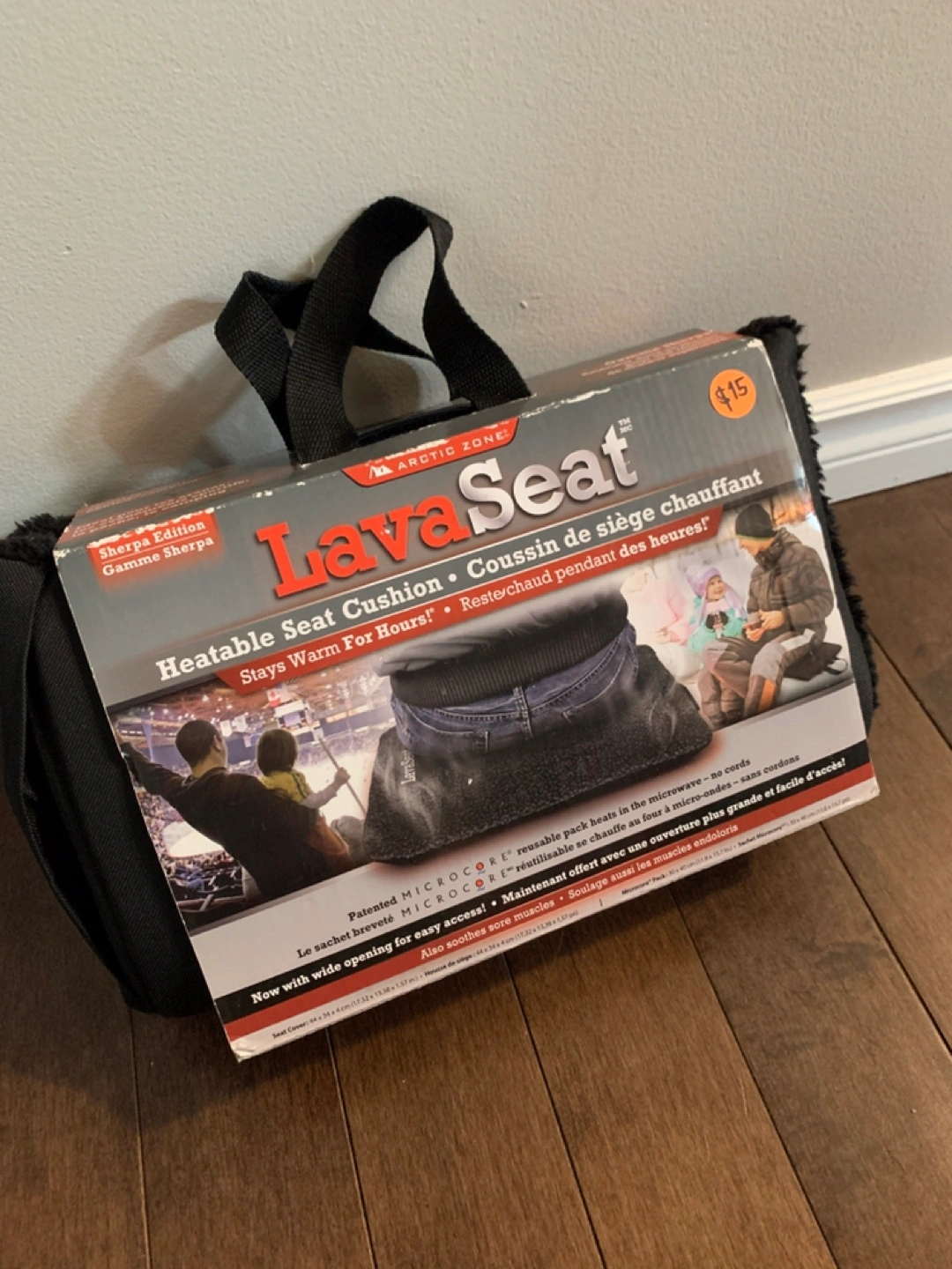 This Lava Seat features a patented MICROCEL reusable pack that heats in the microwave. It's lightweight, durable, and comes in a carry pack. Stays warm for hours!