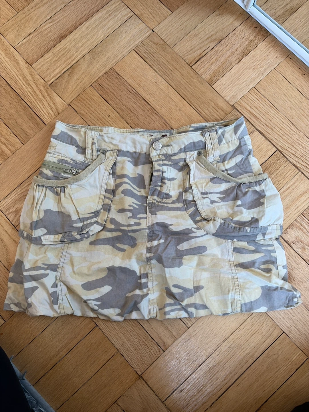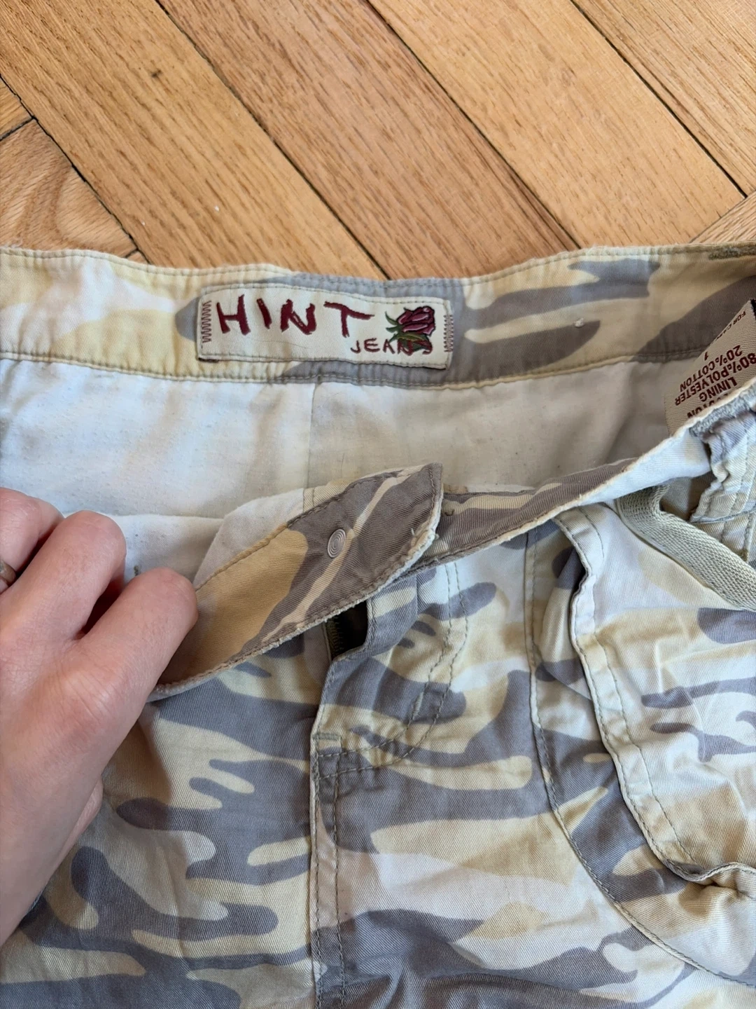 Hint Jeans cargo skirt with a camouflage print. Body is 100% cotton with an 80% polyester and 20% cotton lining. It has multiple pockets and a zip fly.