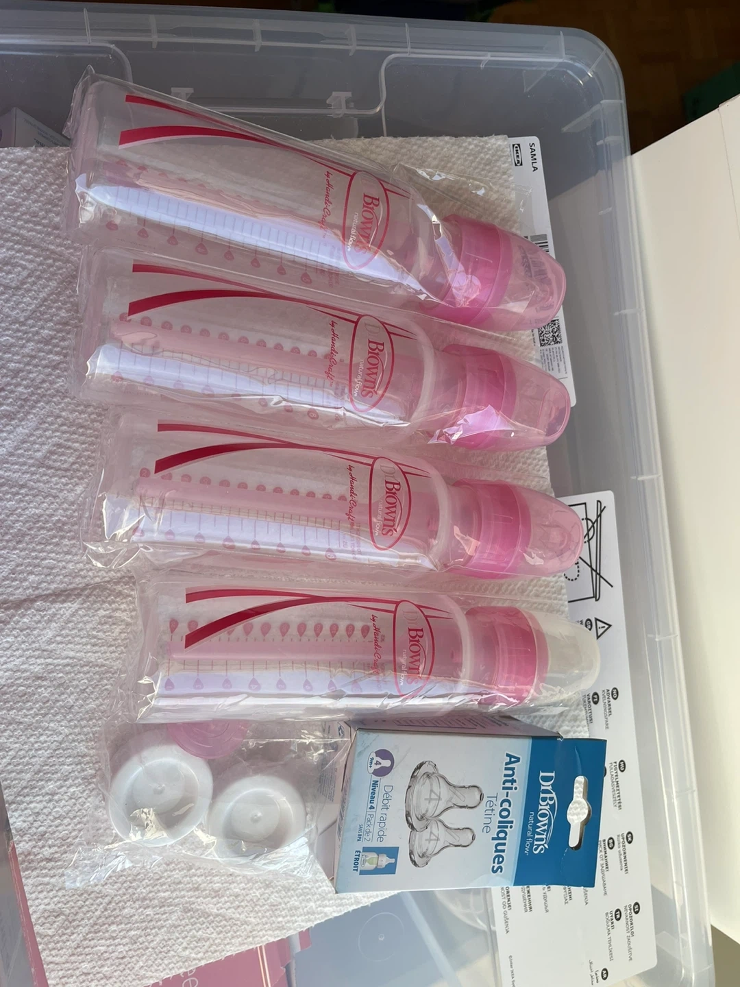 Four Dr. Brown's Natural Flow anti-colic baby bottles in pink are included (3 level 1 nipples & 1 level 3 nipple). With FREE pack of level 4 nipples. Made with BPA-free plastic.