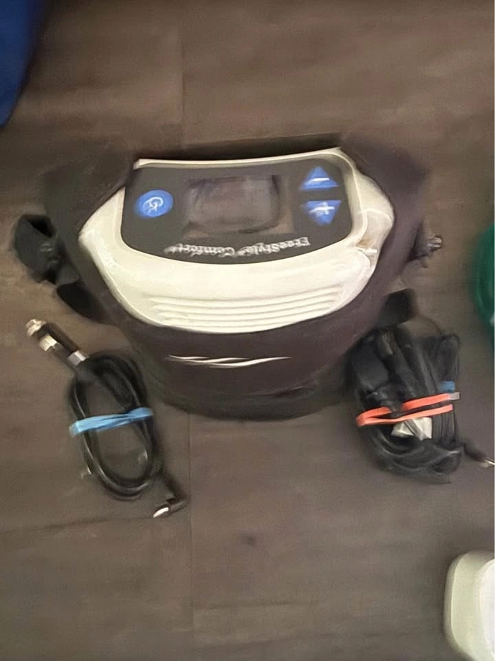 This is a compact and lightweight portable oxygen concentrator with a curved design for comfort. The device uses pulse dose technology to deliver oxygen when the user inhales, conserving battery life. Comes with an extra battery, an additional battery charger, and all charging cables, including a car adapter. Original new cost for the concentrator with one battery was $2700, the battery charger was $325, and the spare large battery was $589. Asking $2000 for everything.