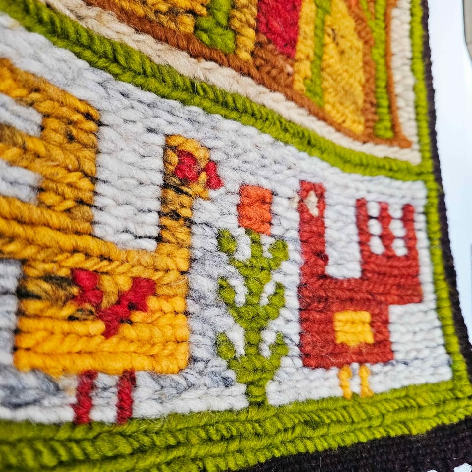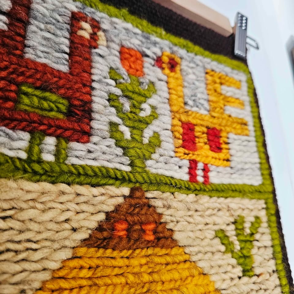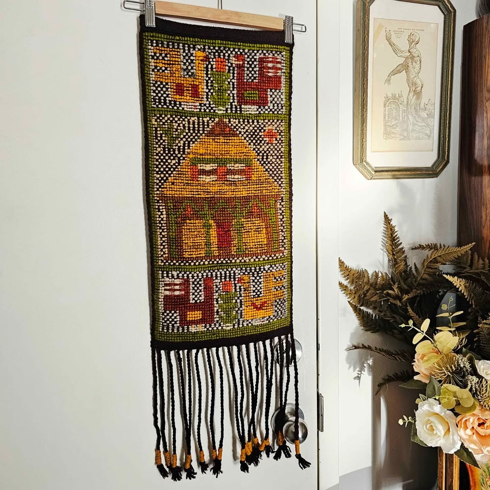 polish folk art, vintage wall hanging, wool tapestry, eastern european textile, 1960s home decor, 1970s home decor, handwoven wall art, boho wall decor, rustic cottagecore, lodgecore art, european folk textile, kitschy vintage decor, cozy bohemian, cabincore, cottage decor, farmhouse