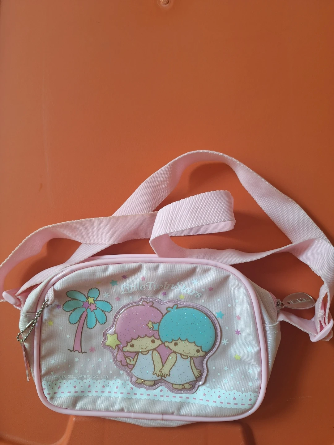 This is a cute pink shoulder bag featuring Little Twin Stars characters. It has a zipper closure and an adjustable strap for comfort. It's perfect for carrying small essentials!