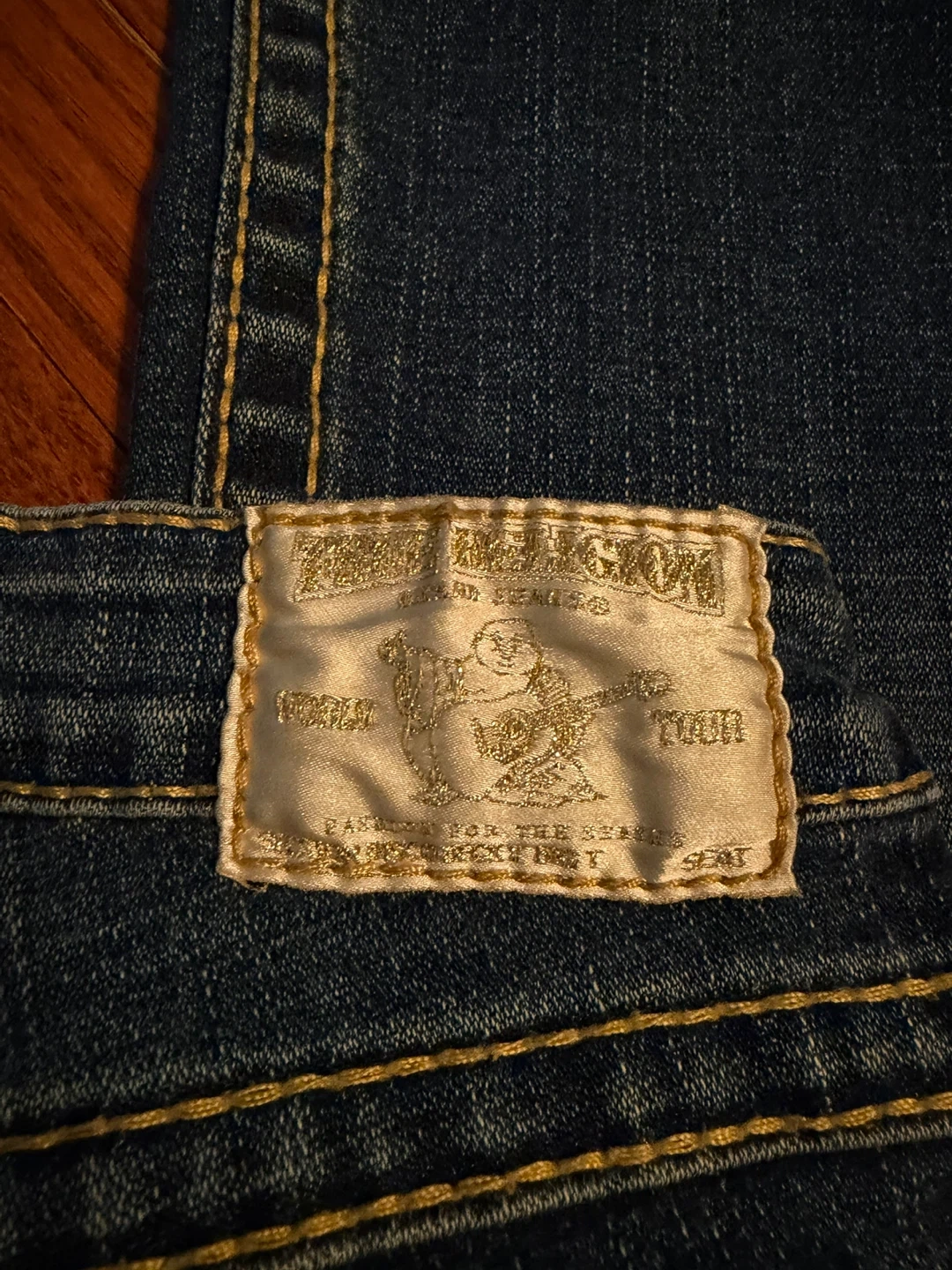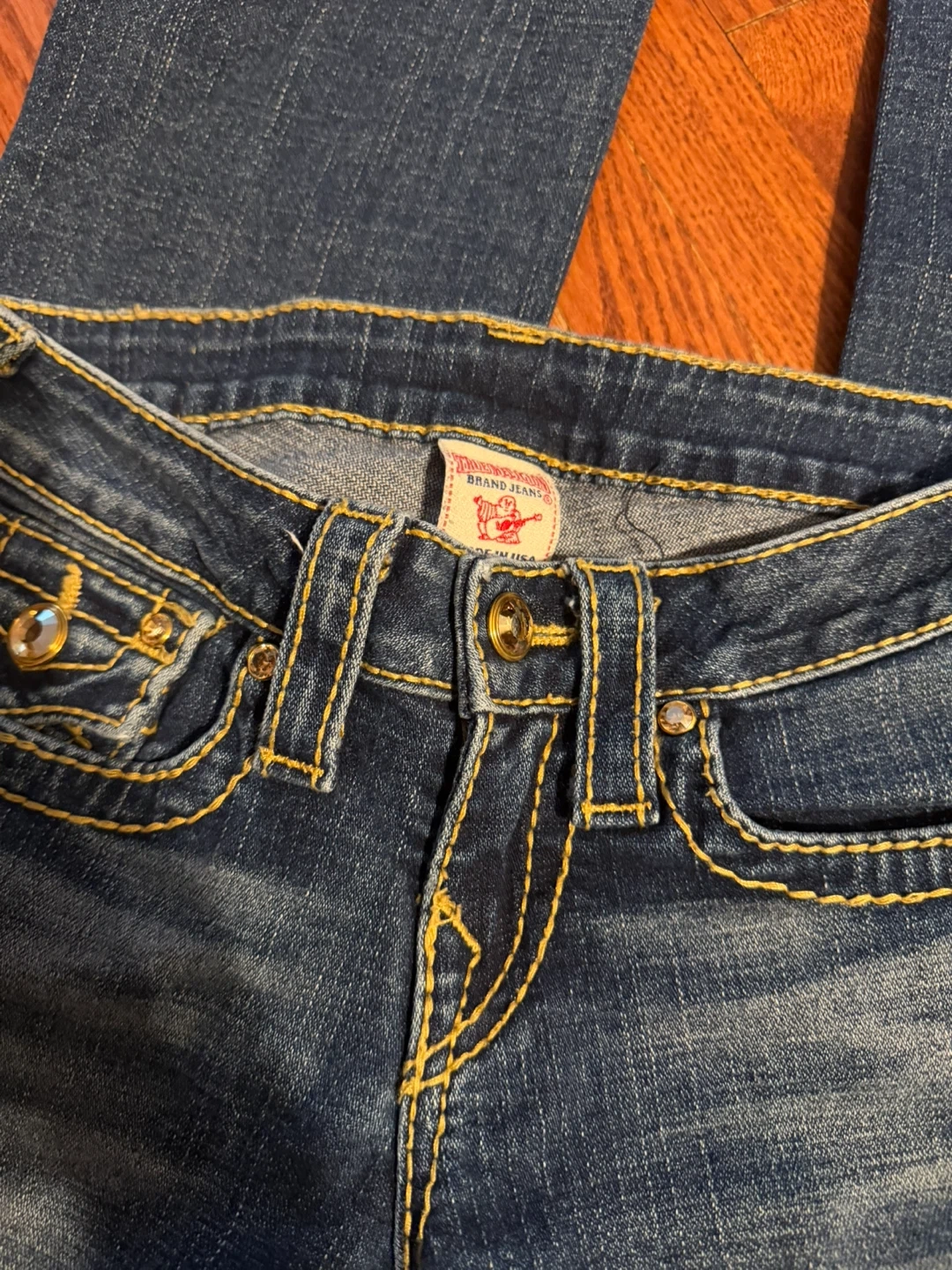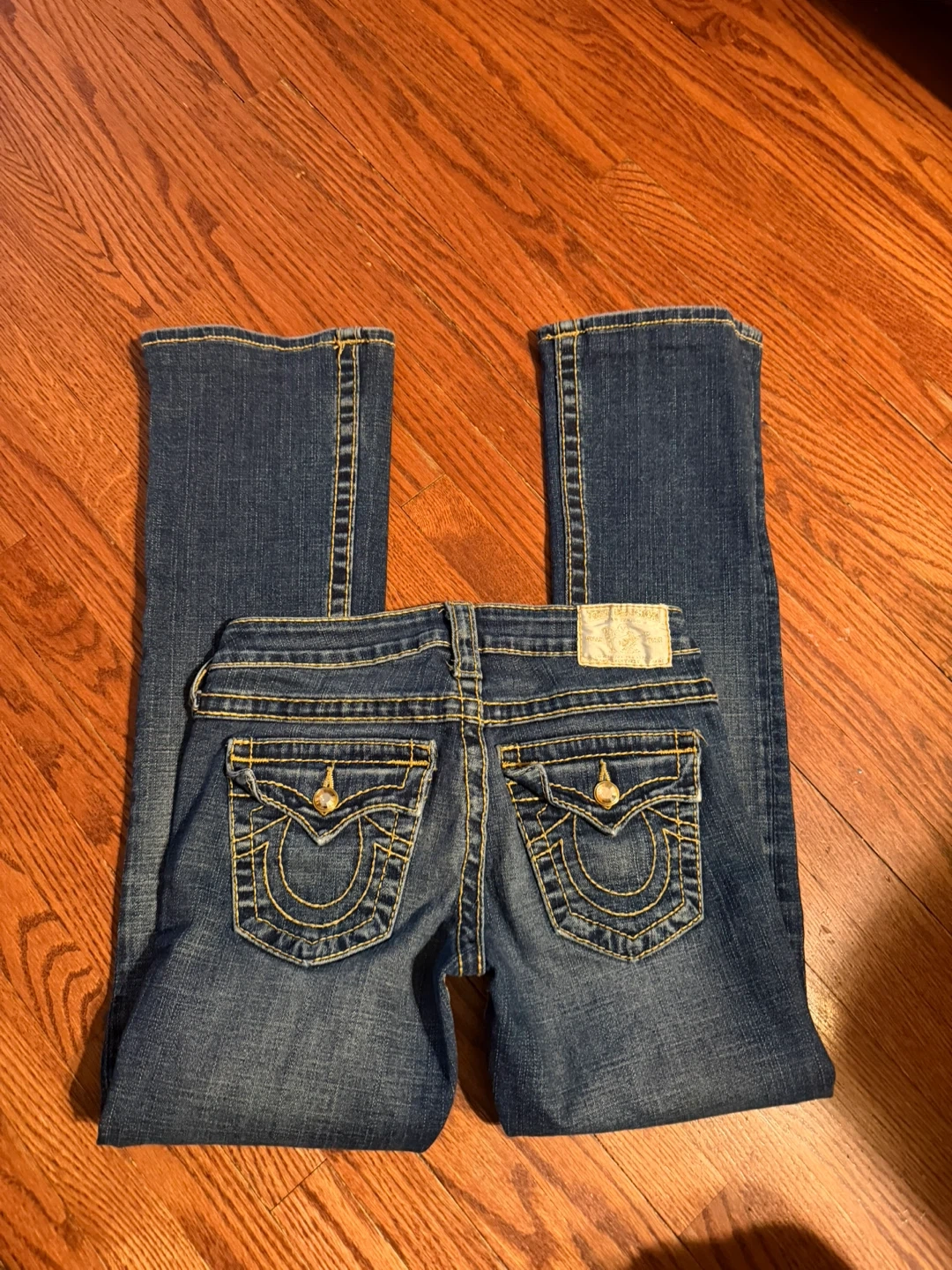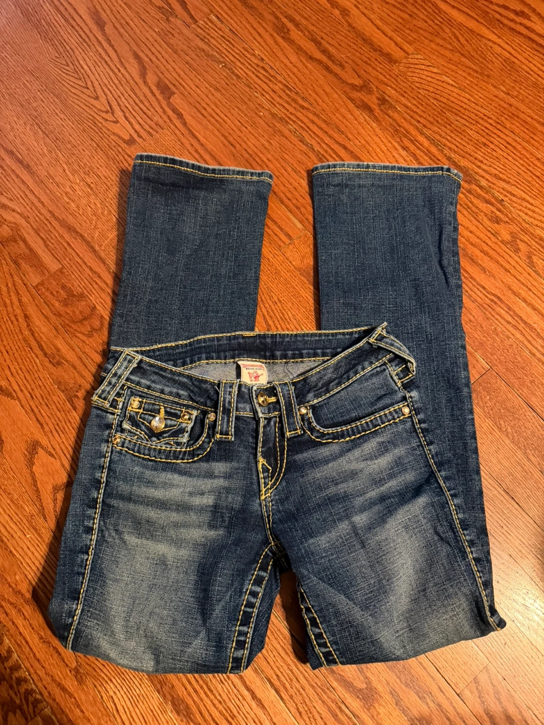 These are True Religion women's bootcut jeans. They're a dark blue wash with yellow contrast stitching. Features the signature horseshoe logo on the back pockets.