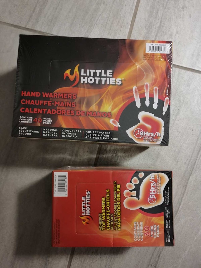 Get ready to face the cold with this combo of Little Hotties hand and toe warmers! The box of hand warmers contains 40 pairs and each warmer provides up to 8 hours of heat. The toe warmers include 30 pairs, with each adhesive warmer lasting up to 5 hours, perfect for keeping your toes toasty in boots or shoes. This is a new item.