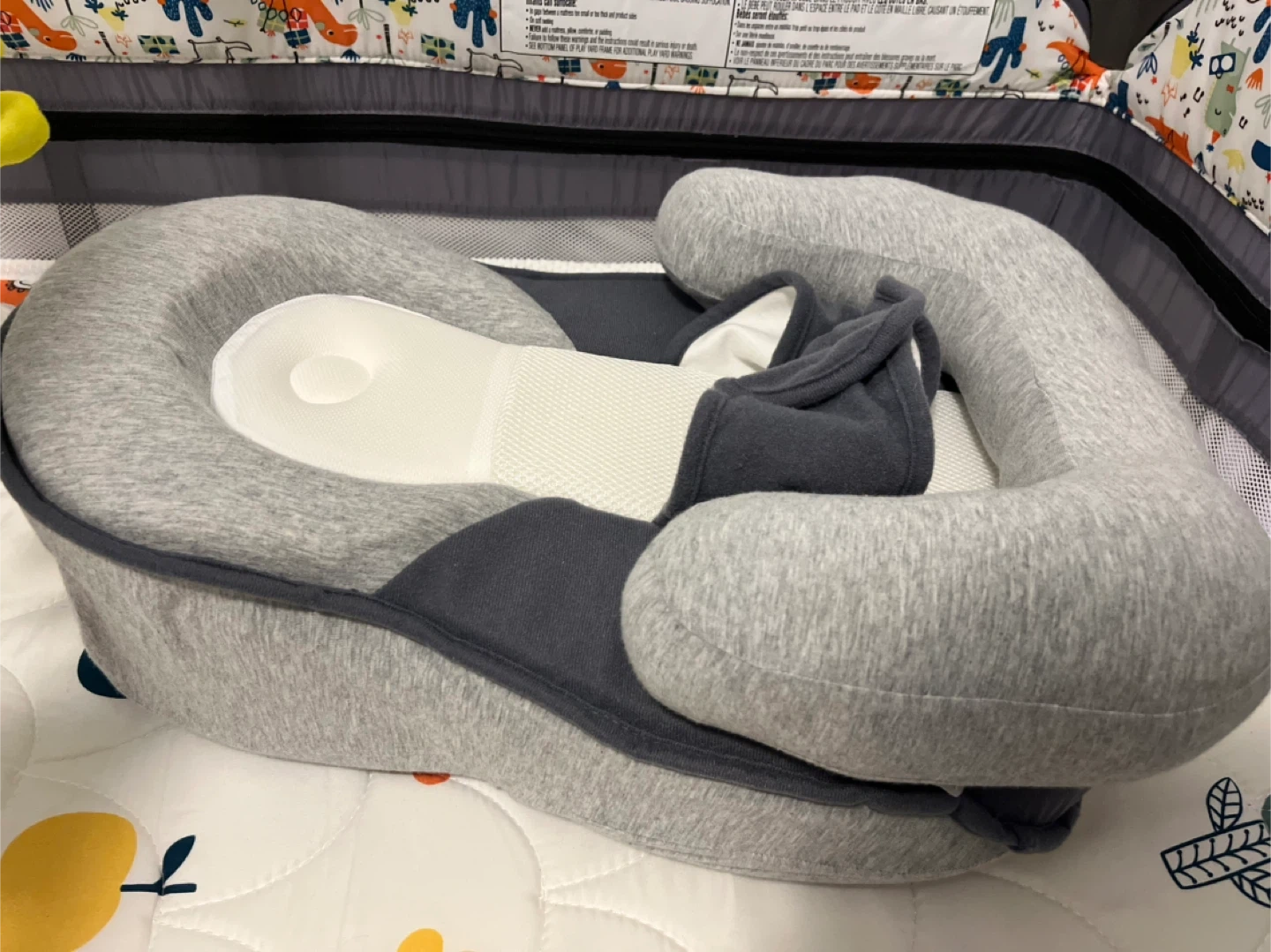 This baby sleep positioner has a soft, breathable cotton cover. It's designed to offer comfort and support for newborns. This provides a cozy space for infants to rest.
