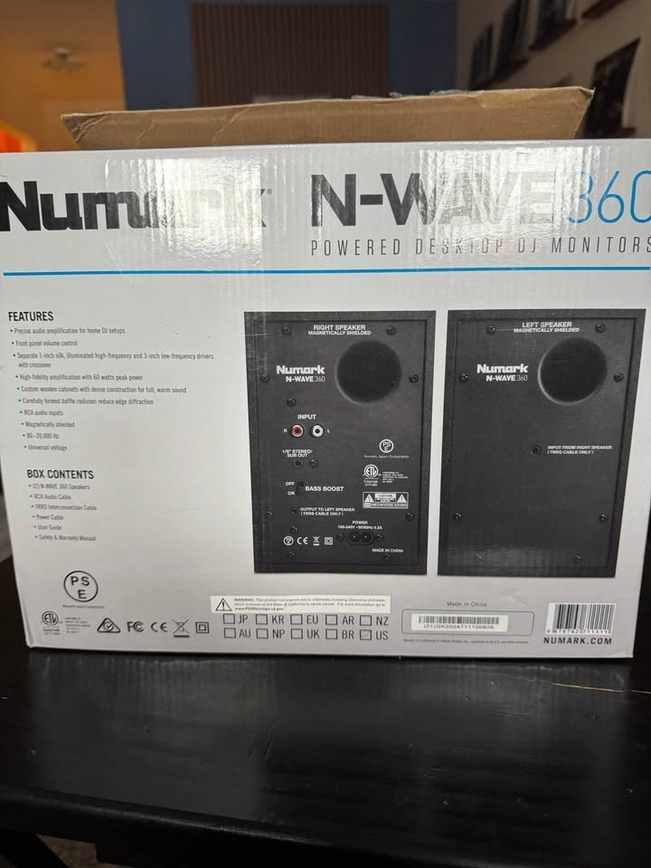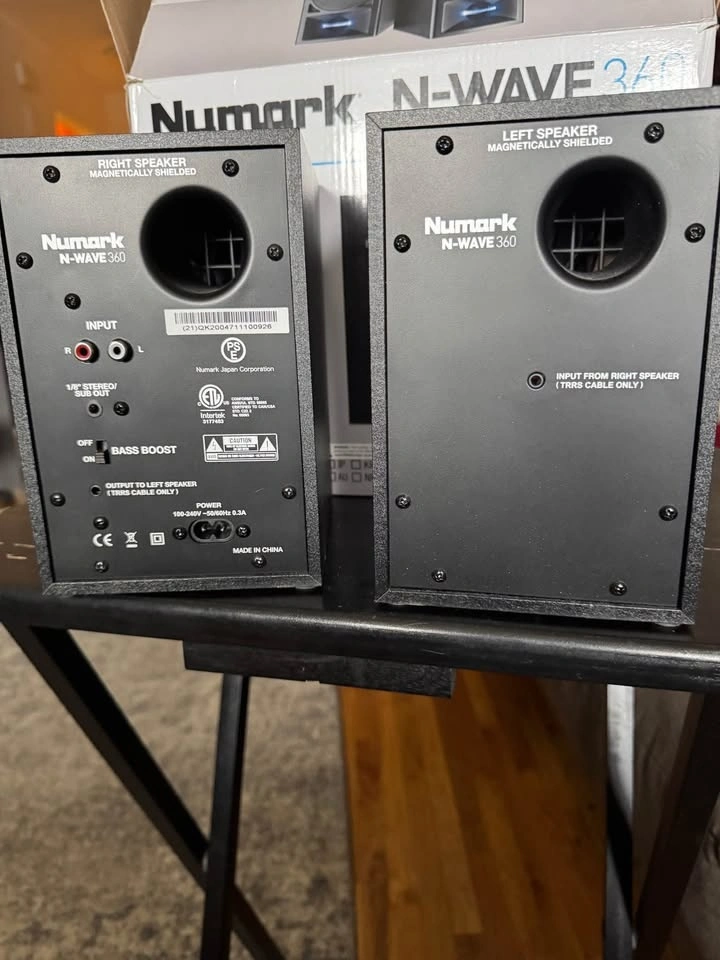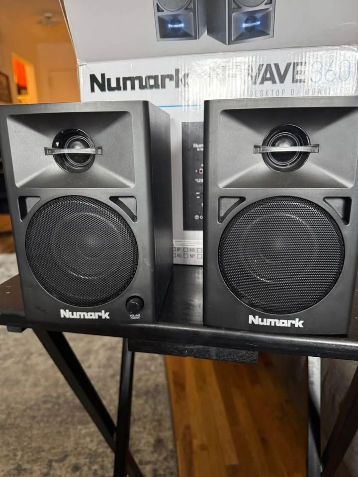 Selling a pair of Numark N-Wave 360 studio monitor speakers, great for home studios. They are 2-way amplified speakers, each with a 1-inch tweeter and a 3-inch woofer. Includes RCA input and an output for the passive speaker. Features a Bass Boost function for emphasizing low frequencies. This set includes one active and one passive speaker.