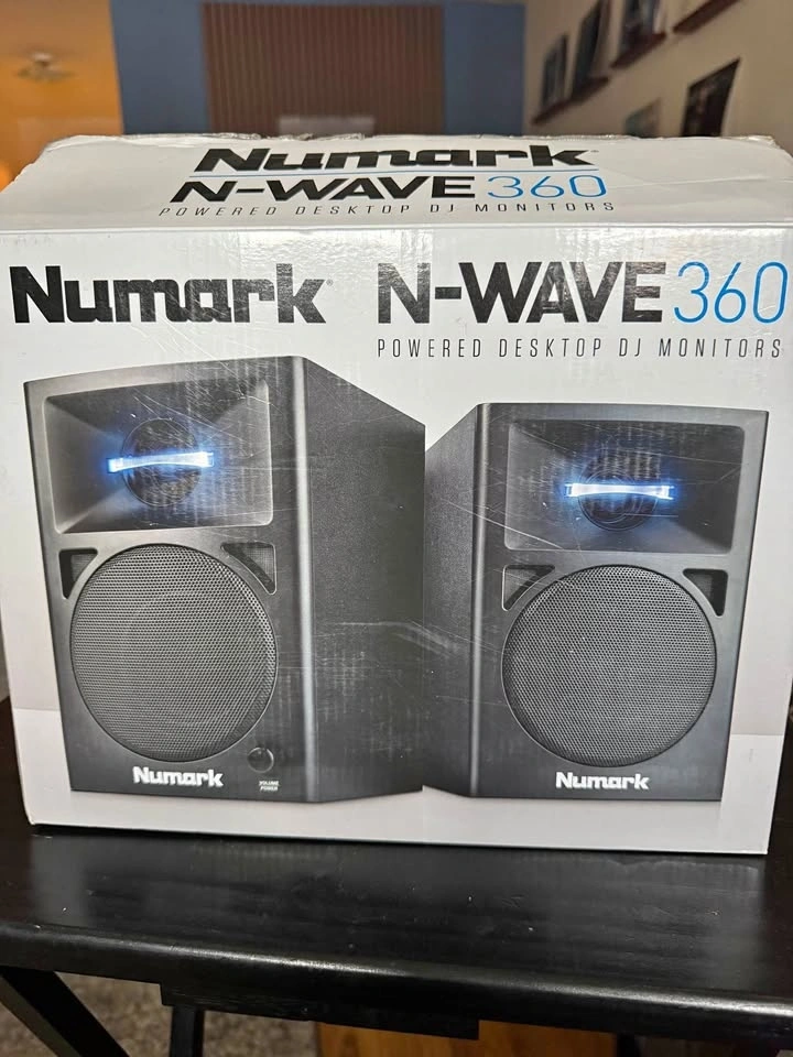 Selling a pair of Numark N-Wave 360 studio monitor speakers, great for home studios. They are 2-way amplified speakers, each with a 1-inch tweeter and a 3-inch woofer. Includes RCA input and an output for the passive speaker. Features a Bass Boost function for emphasizing low frequencies. This set includes one active and one passive speaker.