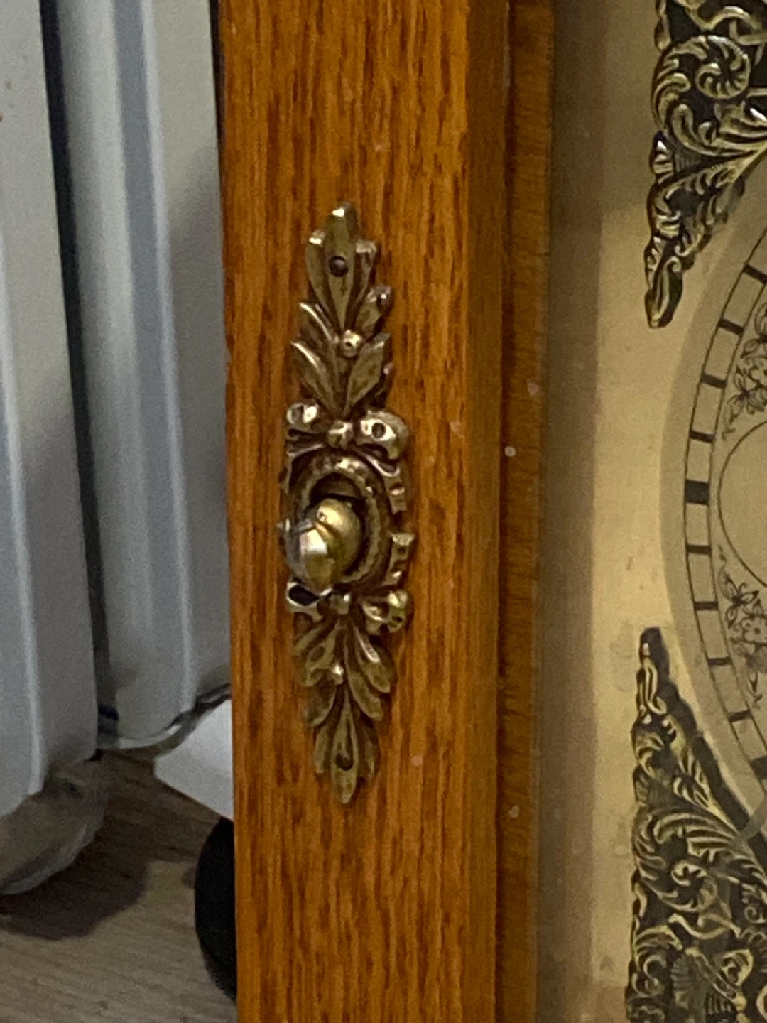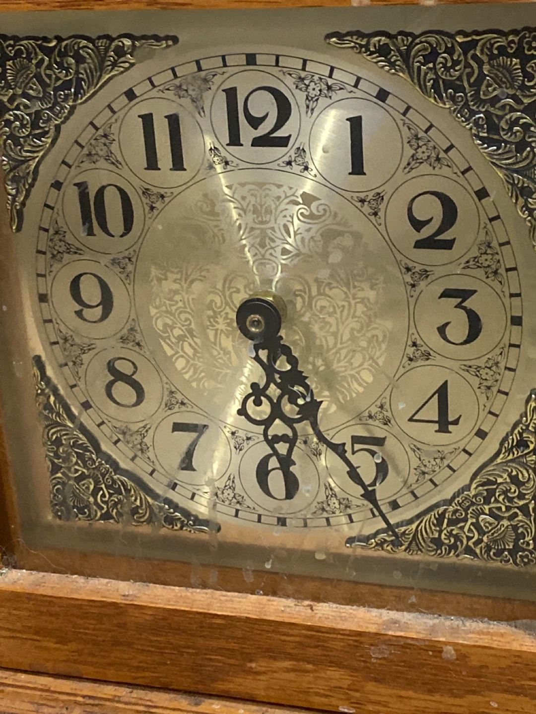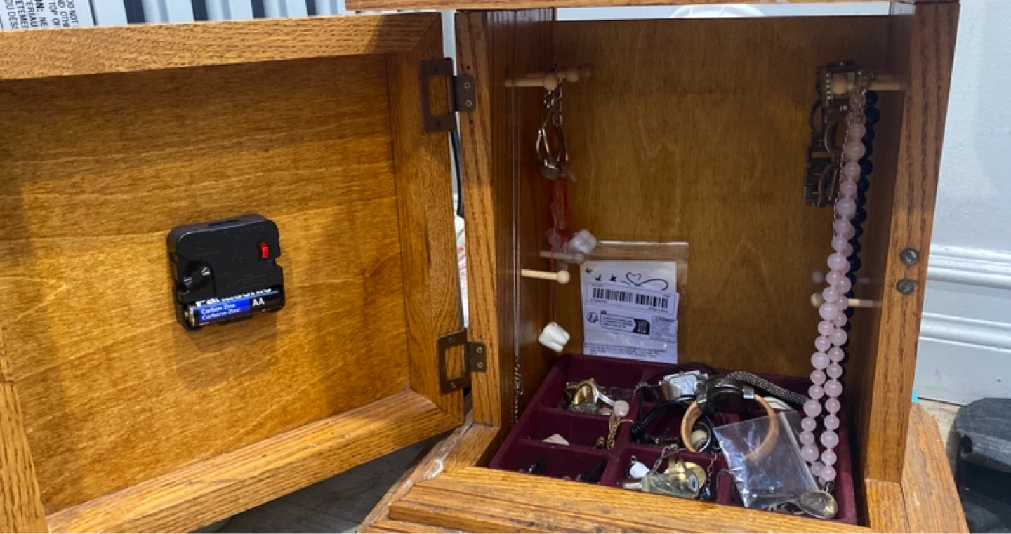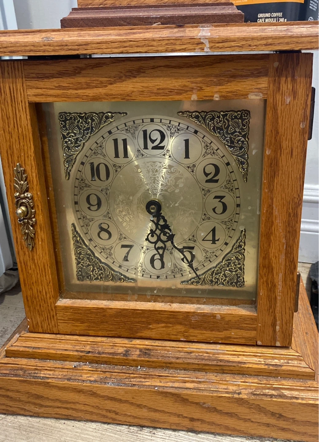 This oak mantel clock features a decorative face and opens to reveal a velvet-lined jewelry box. It's battery operated and includes a compartment for storage. An ornamental piece that's also functional!