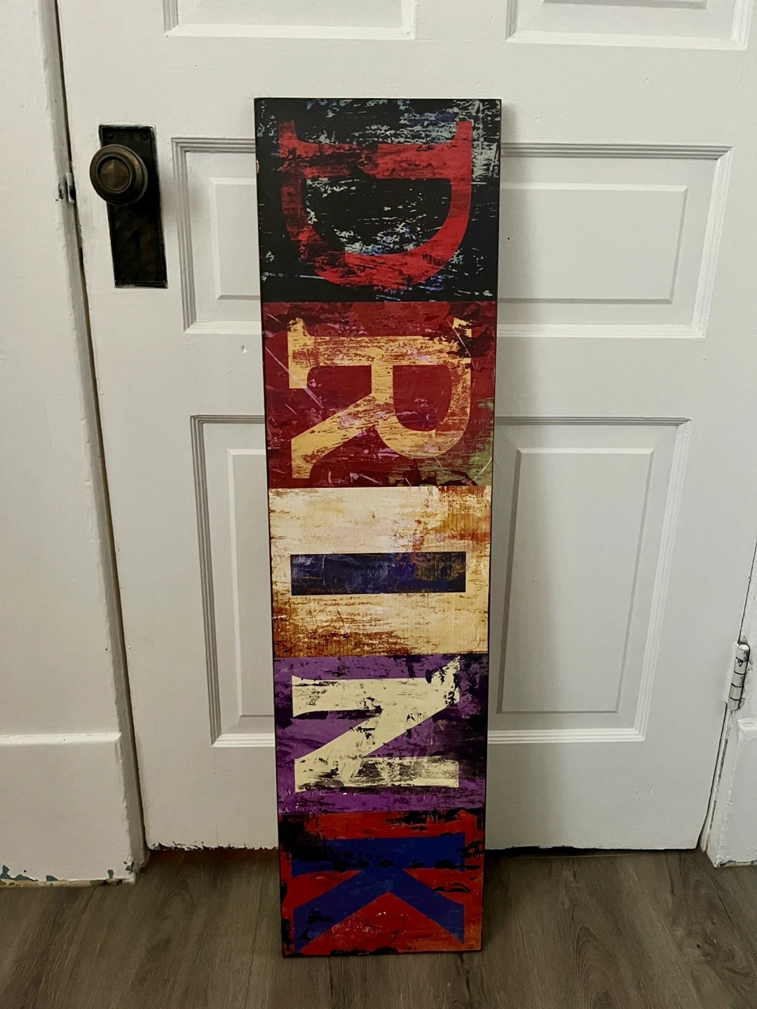 This is a cool, multi-panel wall art piece spelling out the word "DRINK". It features a distressed, abstract design with vibrant colours and textures. Perfect for a kitchen, bar area, or dining room!
