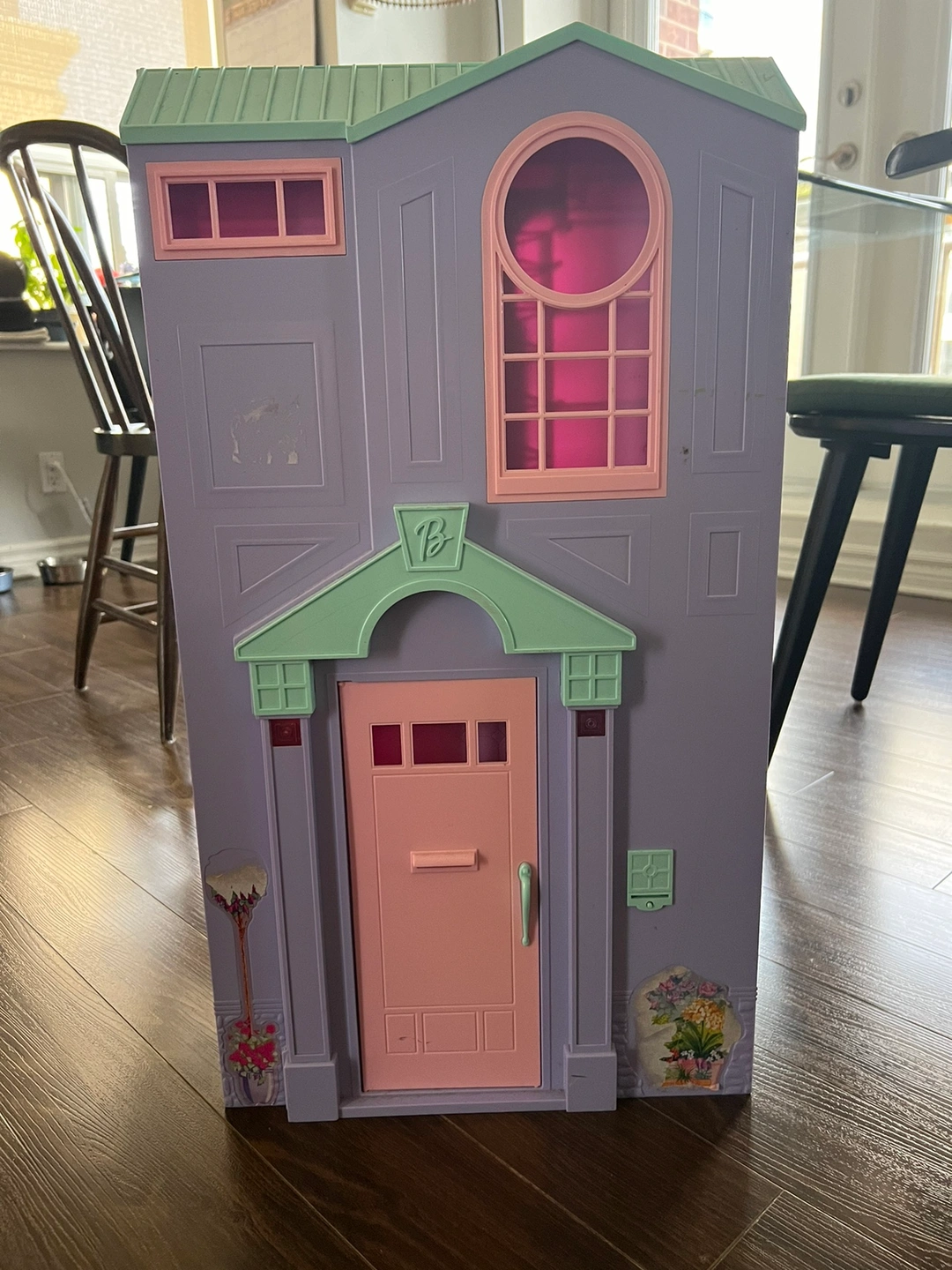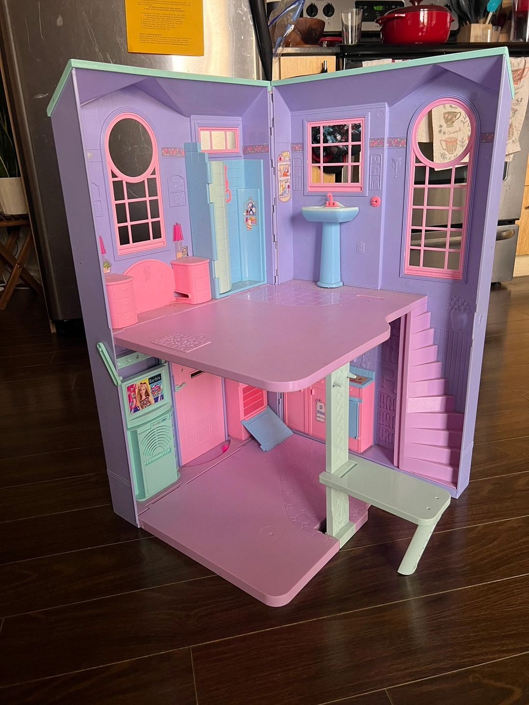 This is a vintage Barbie Dreamhouse. It is a two story house that opens up to reveal a kitchen, bathroom, and bedroom. It’s easy to store behind the doors.