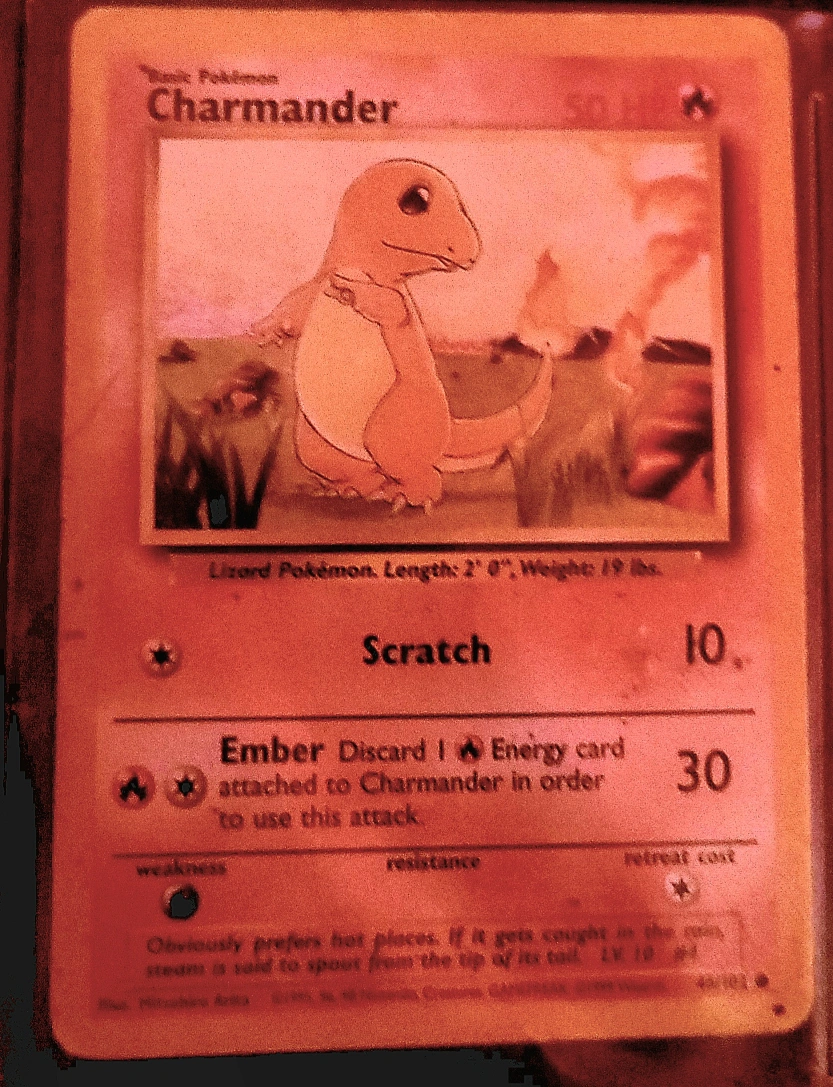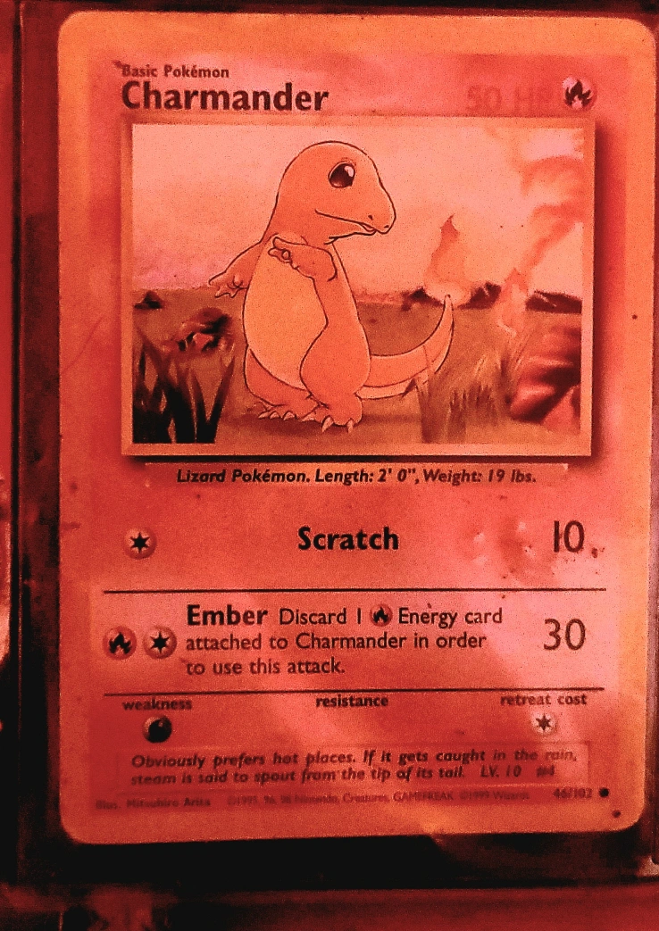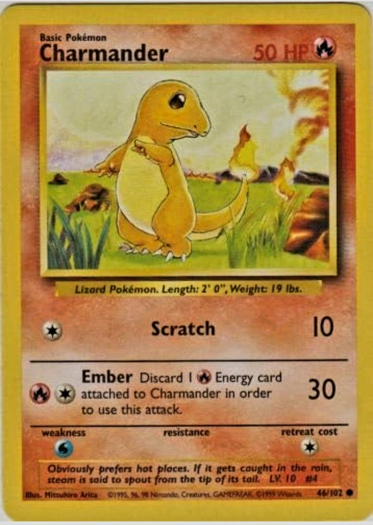 Selling a Charmander Pokemon card. It's in good condition and ready for a new home! It has a 50 HP and the attacks are Scratch and Ember