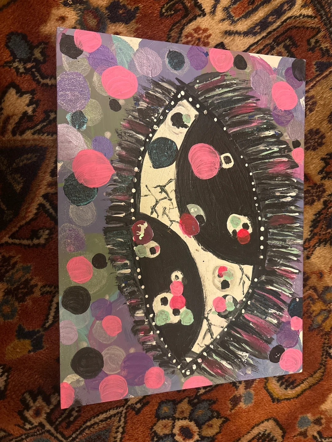 This is a unique abstract painting with a bold yin-yang-like central design surrounded by colourful dots. It's created with acrylic paints on canvas. A striking piece for any wall!