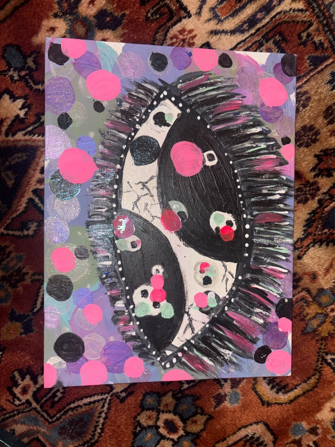 This is a unique abstract painting with a bold yin-yang-like central design surrounded by colourful dots. It's created with acrylic paints on canvas. A striking piece for any wall!