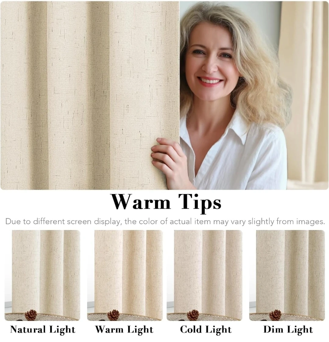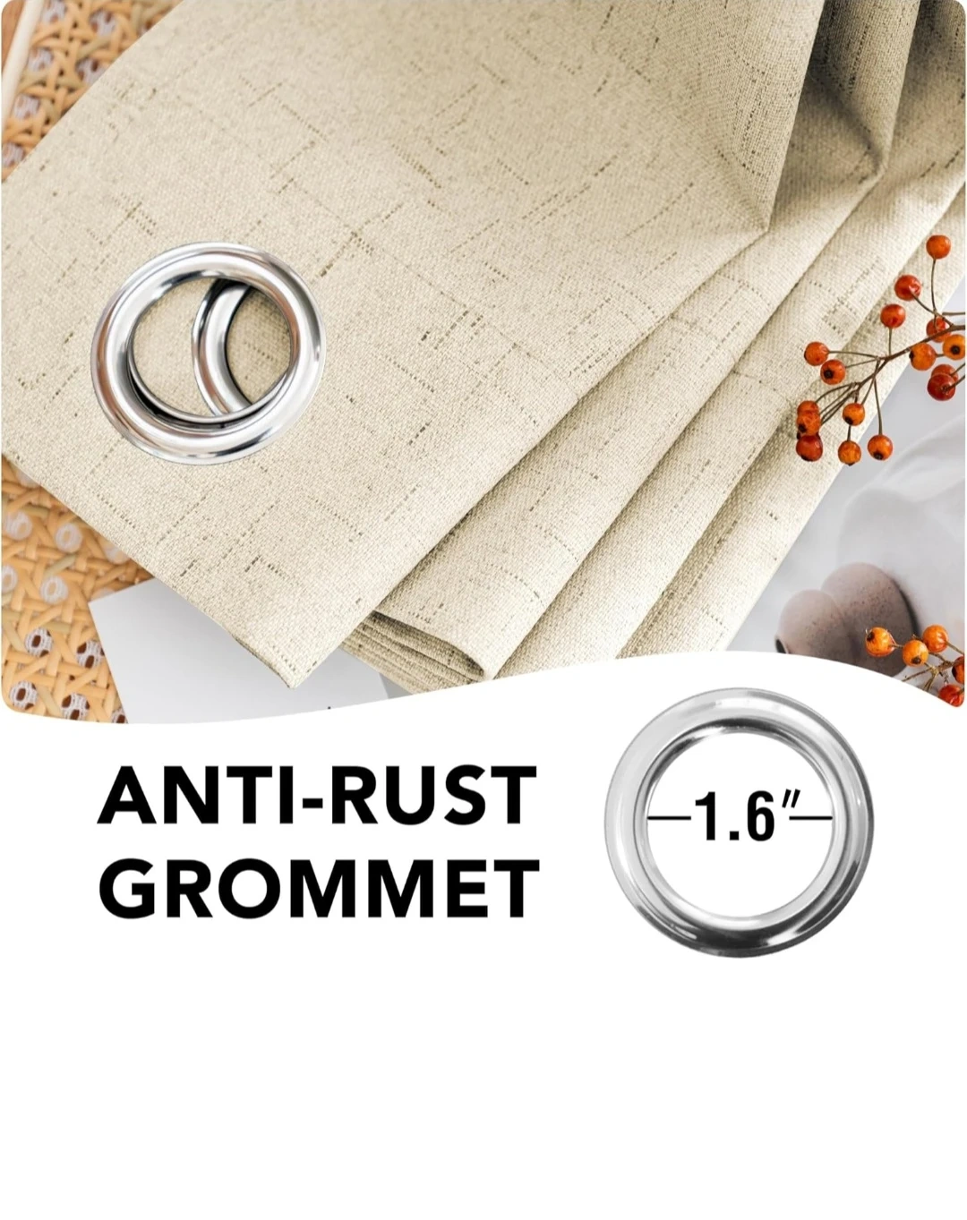 These curtains offer privacy protection and noise reduction. They're made from soft and durable faux linen textured fabric. The anti-rust grommets are 1.6 inches. Easy to machine wash!. 52Wxl x 96 L inches (2 Panels).