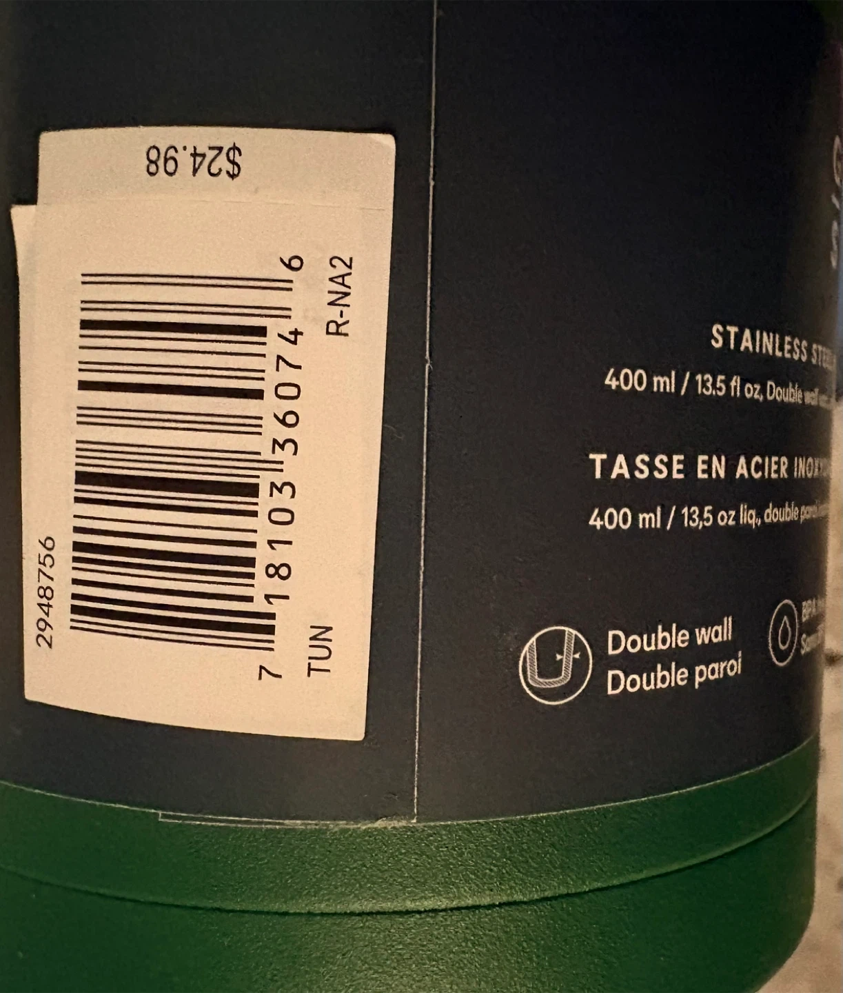 Two dark green tumblers with lids from General Supply Co. Made of stainless steel with double-wall construction. Each holds 400 ml or 13.5 fl oz. They're perfect for keeping your drinks hot or cold!