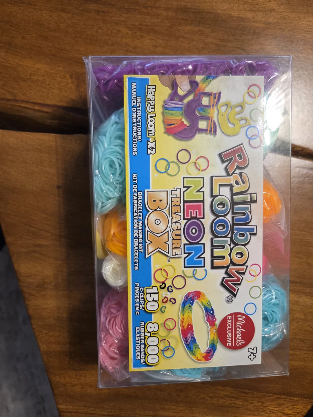 This Rainbow Loom Neon Treasure Box kit includes 8,000 elastic bands and 150 C-clips. It's perfect for making colourful bracelets and fun crafts. The kit is recommended for ages 7 and up!
