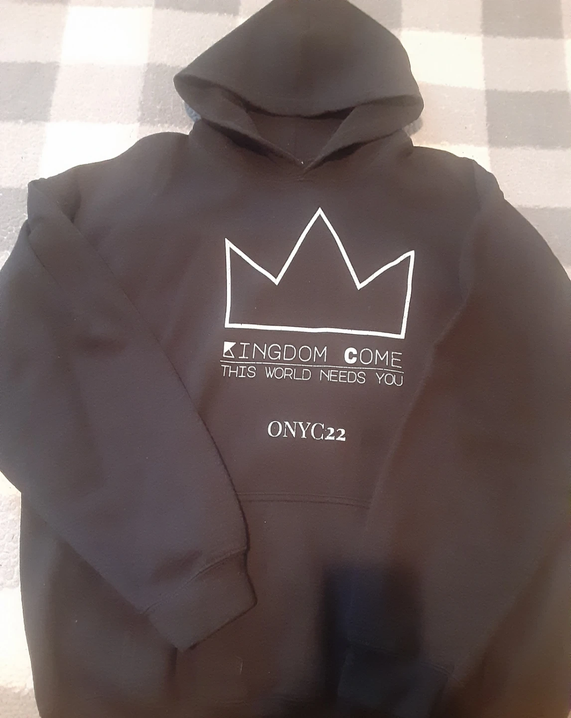 A black Gildan hoodie with "Kingdom Come This World Needs You" and "ONYC22" printed on the front. It's a comfortable hooded sweatshirt.