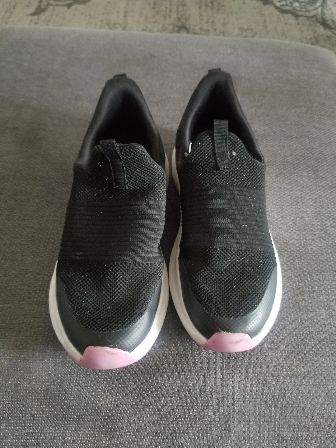 Hey Fellow Karroters 🧡 These black slip-on sneakers feature a comfortable mesh upper and a durable rubber sole with pink accents. They're designed for easy wear. The size marked on the sole is 4. Just want Gone Don't Need Asking $5