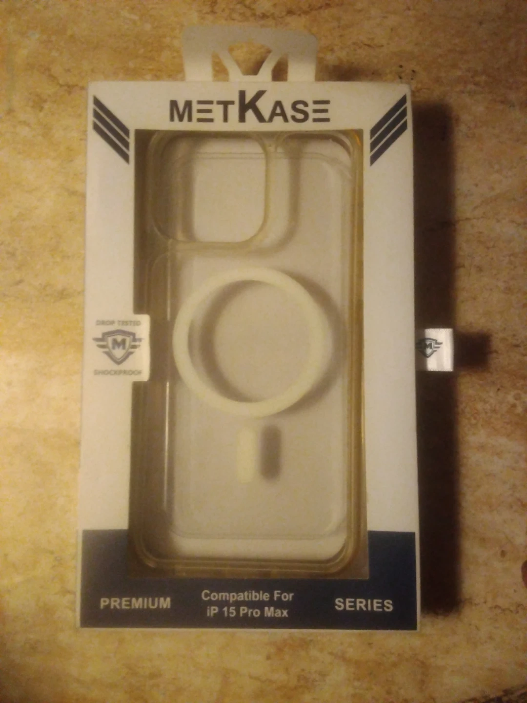 This is a METKase clear phone case. It's compatible with the iPhone 15 Pro Max. The case is designed for premium protection.