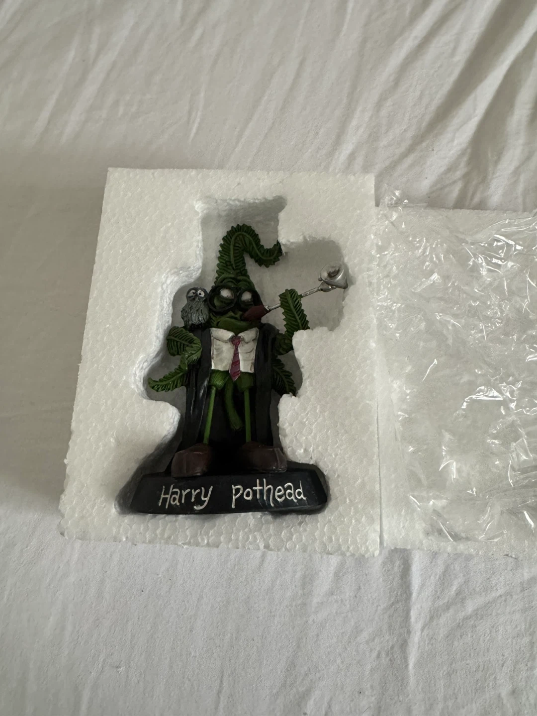 This is a Harry Pothead figurine featuring a frog character with glasses, a green hat, and a tie. It includes a small owl perched on its shoulder and a smoking pipe. The figurine is housed in its original styrofoam packaging.