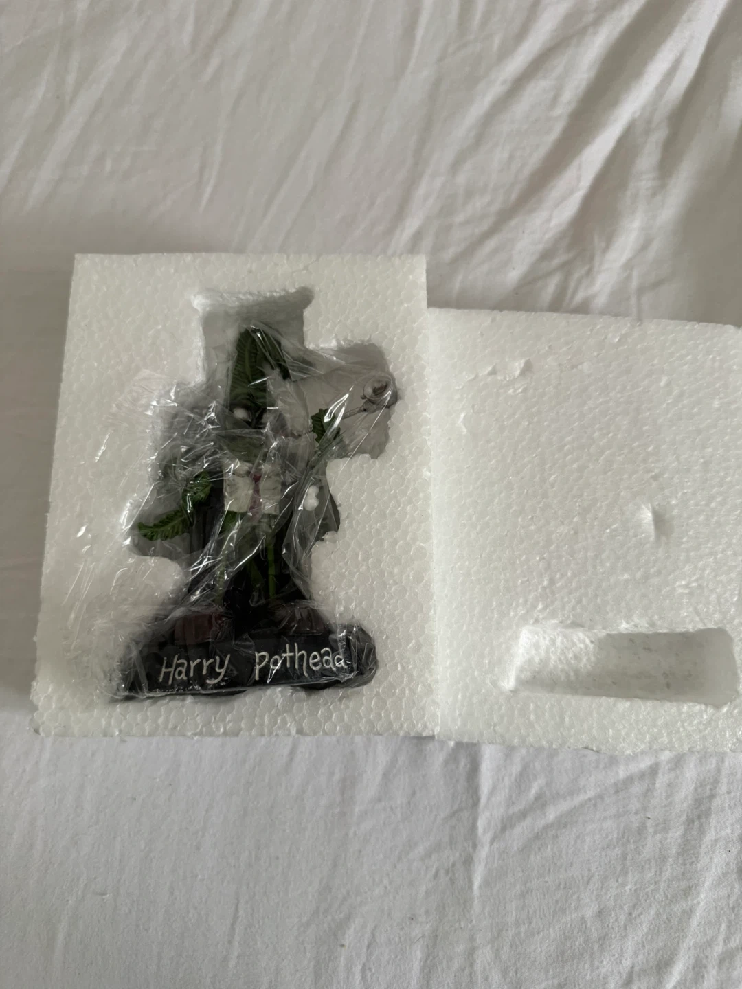 This is a Harry Pothead figurine featuring a frog character with glasses, a green hat, and a tie. It includes a small owl perched on its shoulder and a smoking pipe. The figurine is housed in its original styrofoam packaging.
