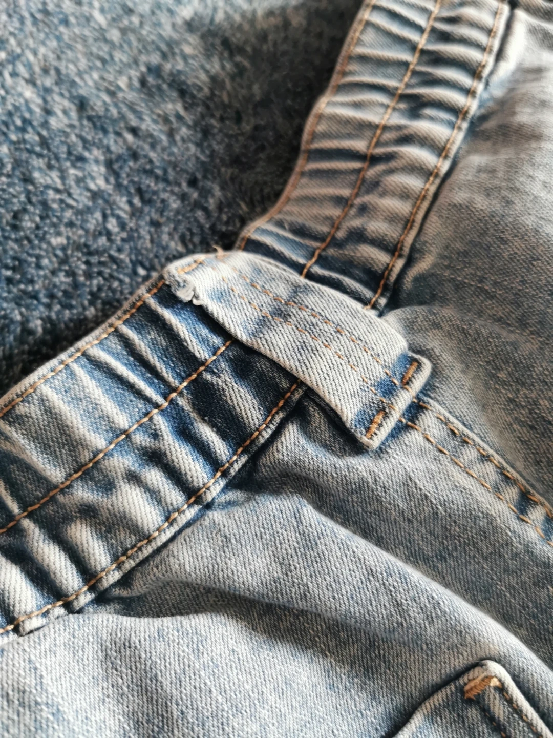 These are light wash denim cargo pants from Ardene. They're a size S/P and feature an elastic waistband with a button closure. Made in Bangladesh.