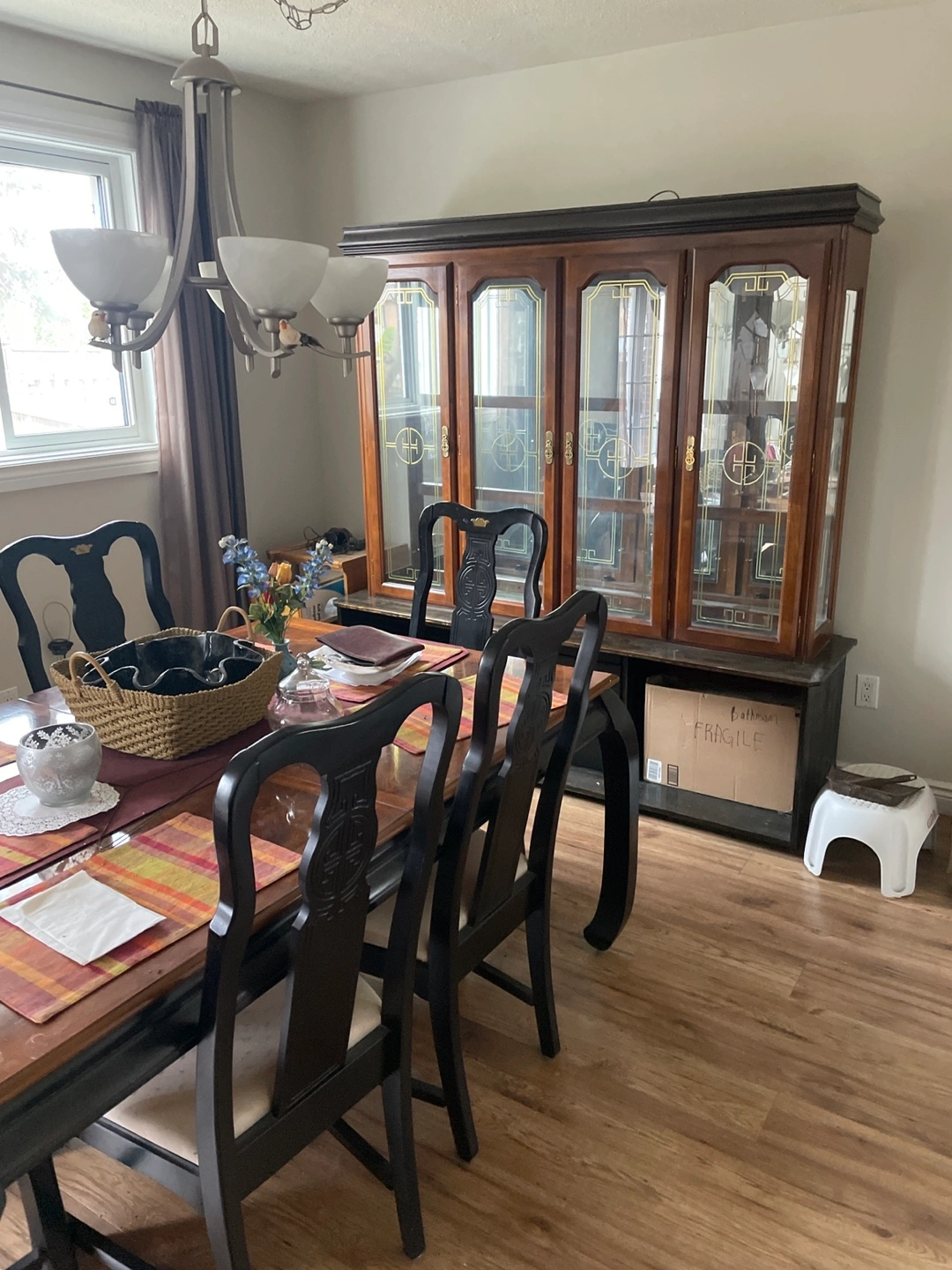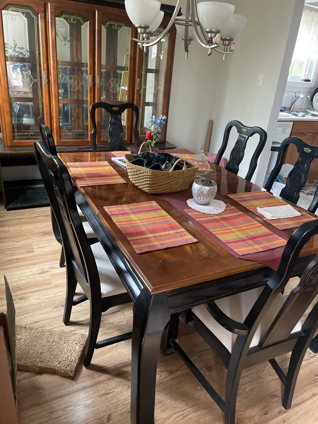 Solid wood dining table with six chairs. Black finish. Traditional style. Minor wear. Matching hutch also available. come and grab it for free.