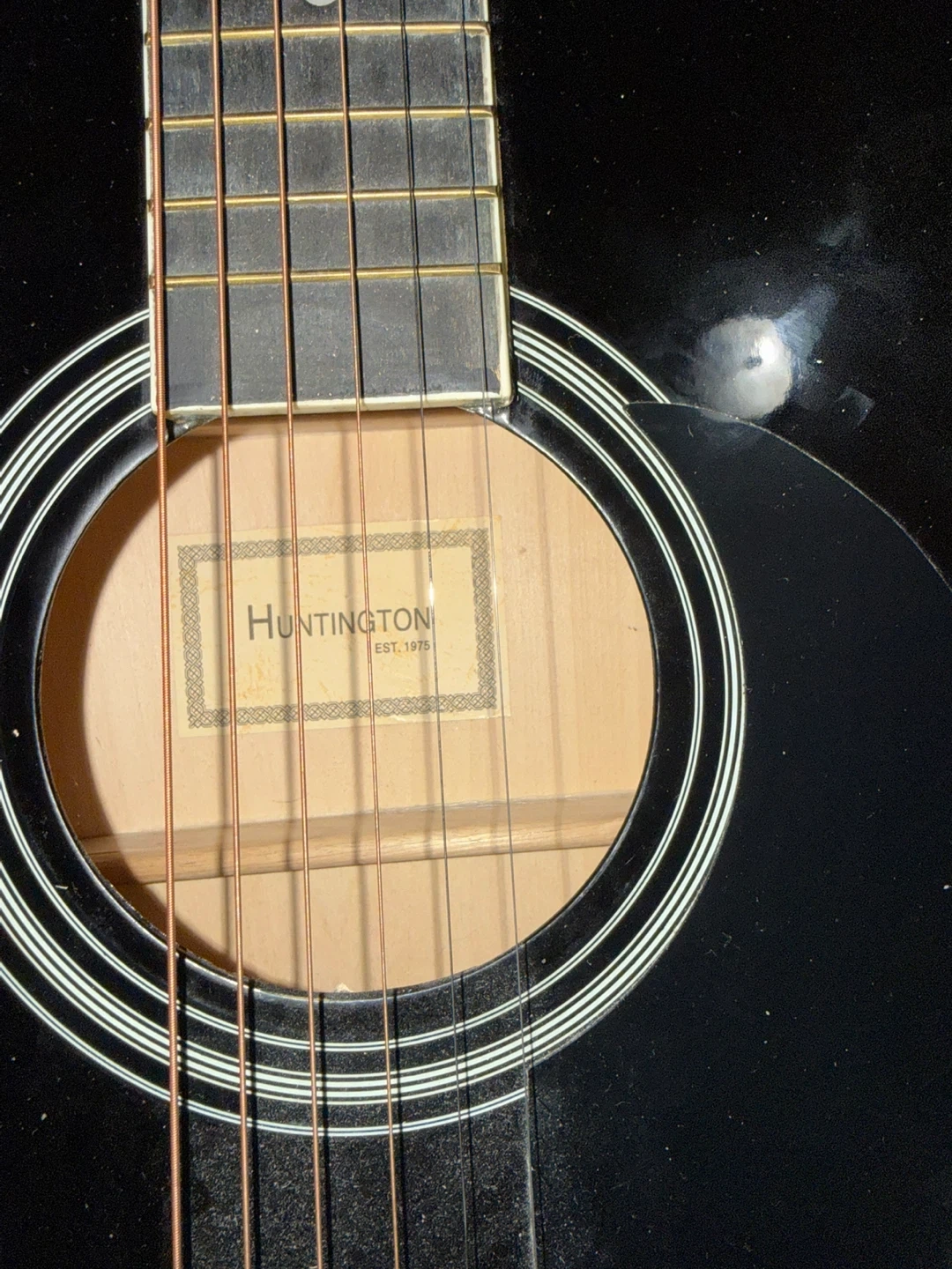 Huntington black acoustic guitar in great condition. Sounds clear and warm, easy to play, and perfect for beginners or casual players. No cracks or major damage, well cared for. NEED IT GONE ASAP