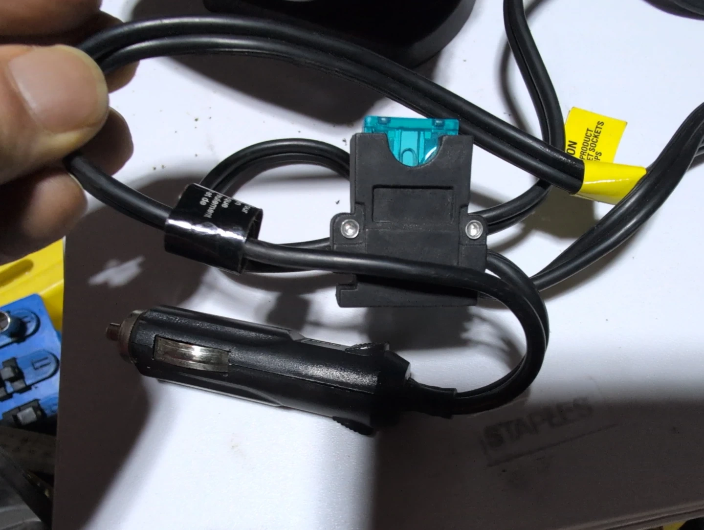 This portable 12V DC heater fan is for your vehicle. It has two settings: fan and heat. The unit plugs into your car's cigarette lighter socket and includes a fuse. Great for keeping your car warm on cold days!