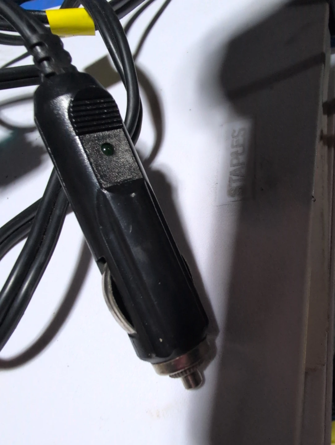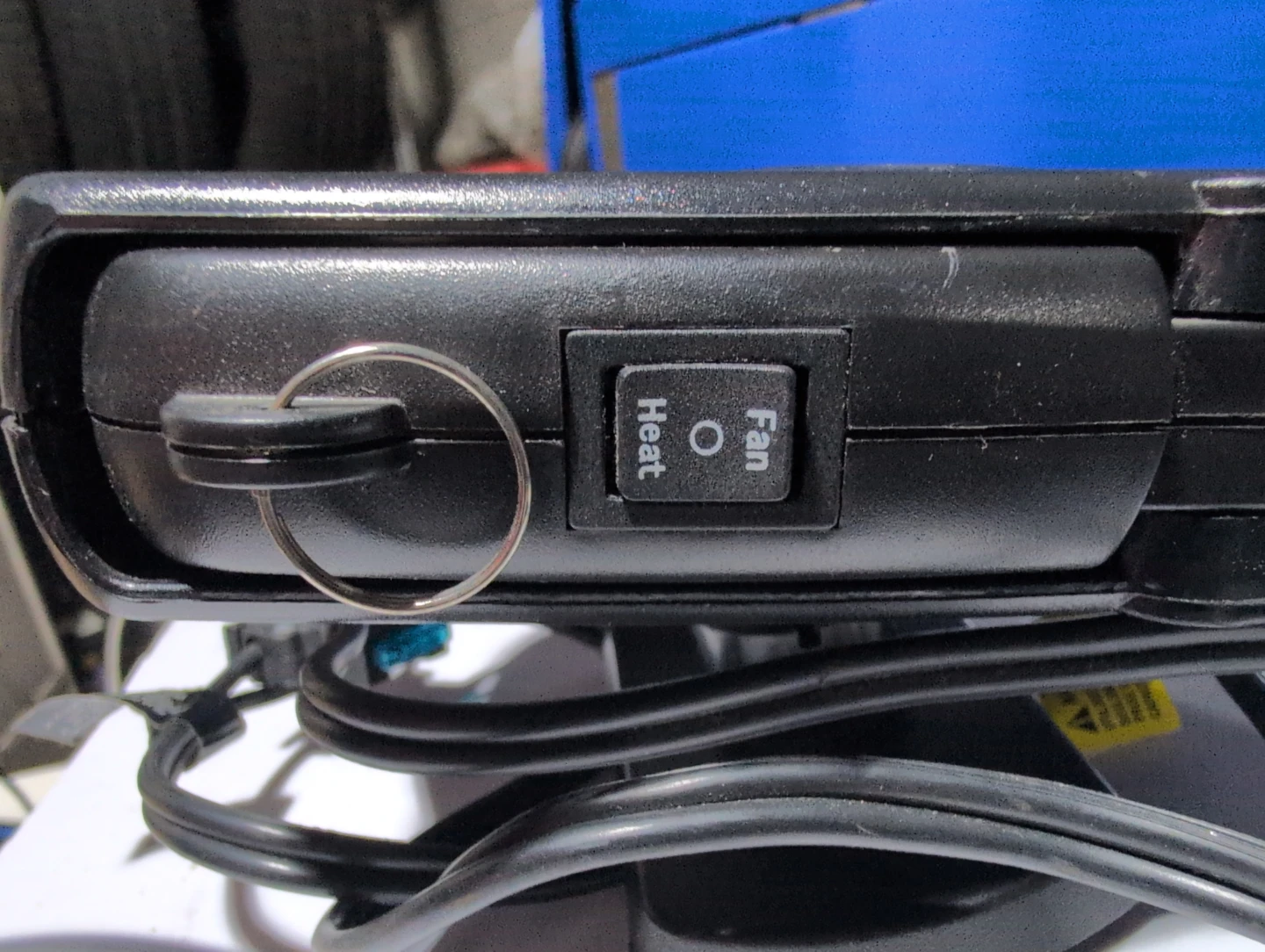 This portable 12V DC heater fan is for your vehicle. It has two settings: fan and heat. The unit plugs into your car's cigarette lighter socket and includes a fuse. Great for keeping your car warm on cold days!