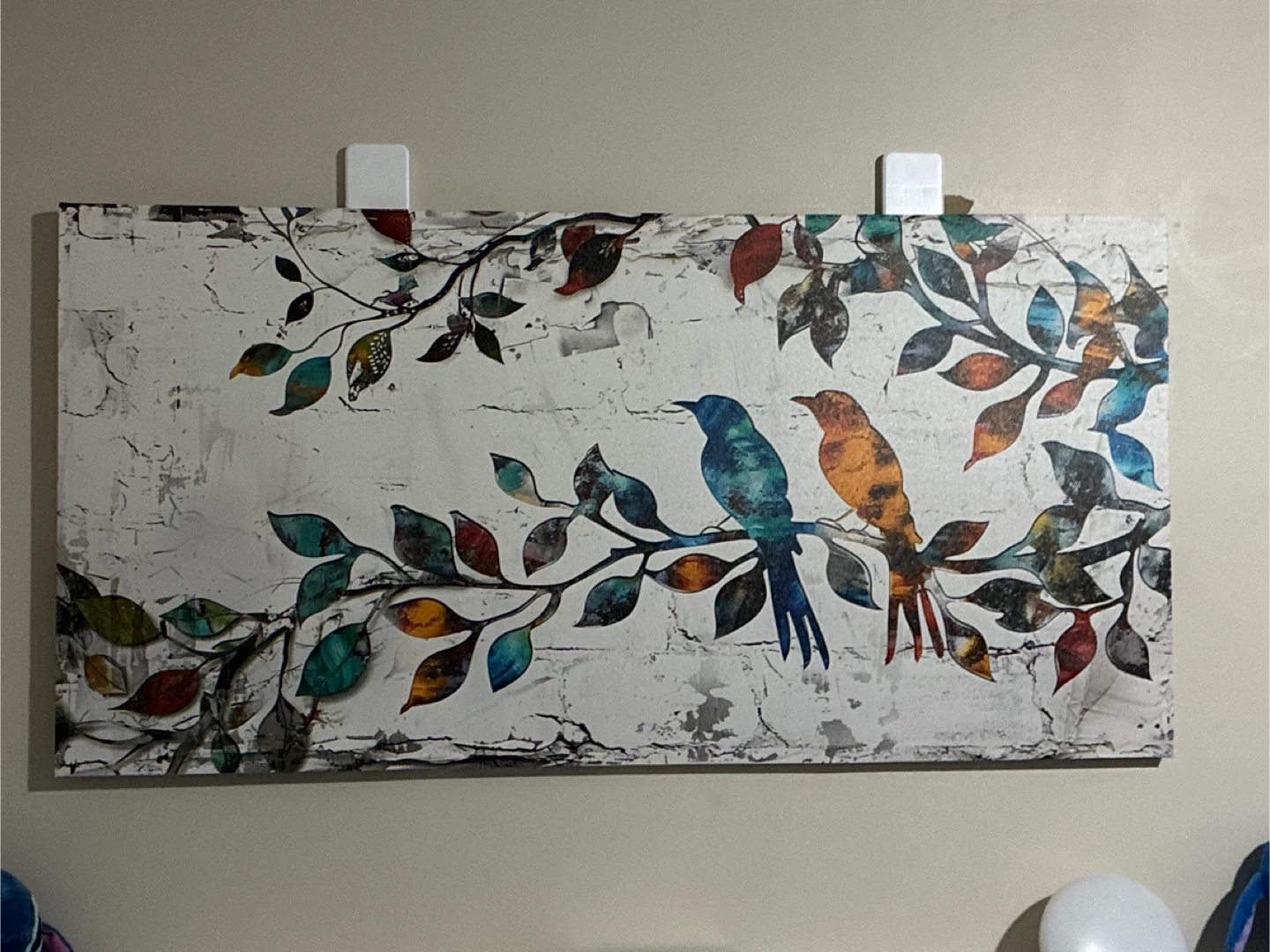 Beautiful framed wall art for sale. Features a colorful bird and floral design that adds warmth and character to any space.