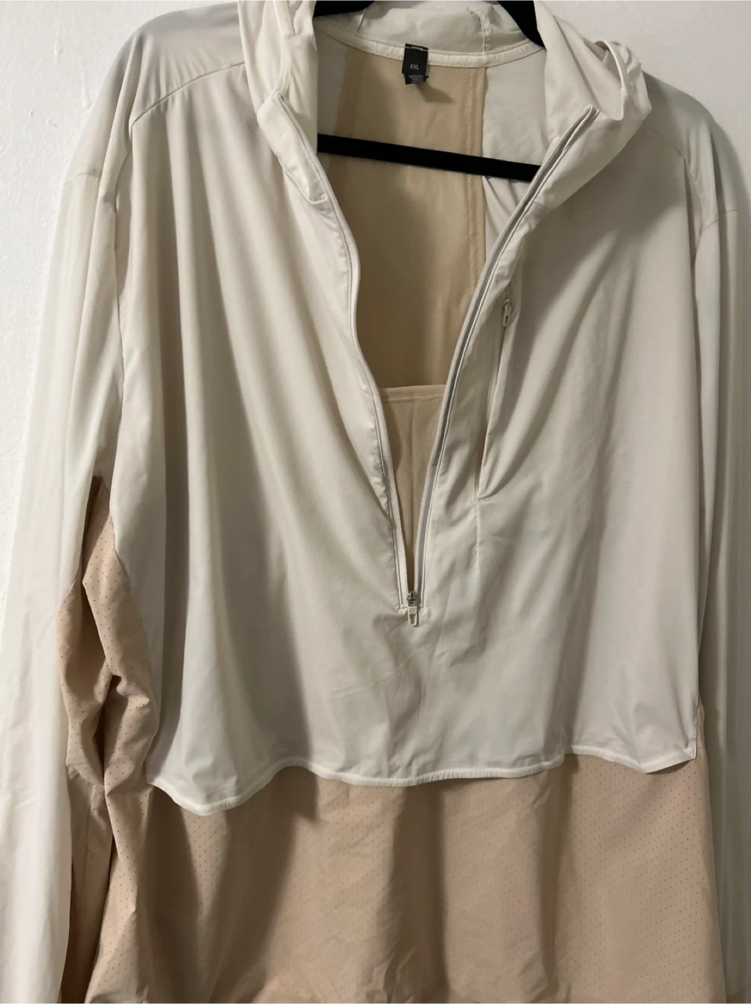 Selling a beige windbreaker jacket in size XXL. It's in great condition and perfect for layering or outdoor activities. The jacket features a hood and a zipper closure lulu lemon