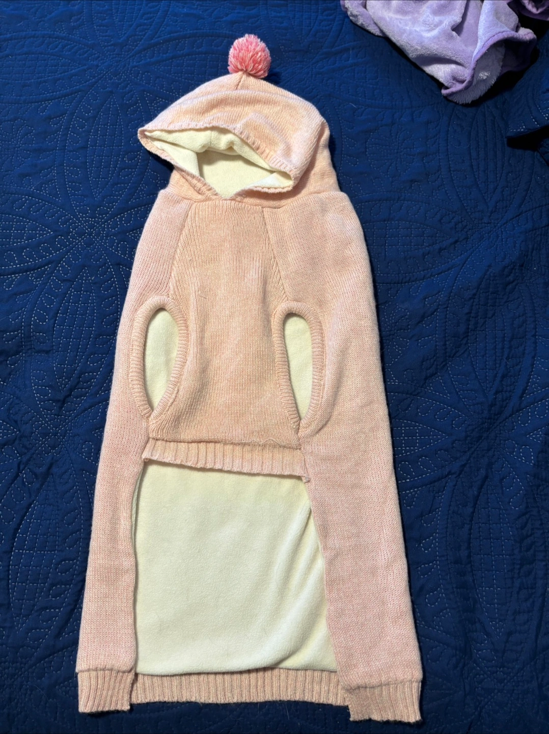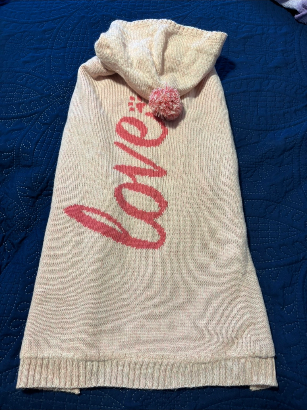 A cute pink dog hoodie, perfect for keeping your furry friend warm! It features a hood with a pompom and the word 'Love' on the back. It's in great condition and ready for a new home. Size is XXL