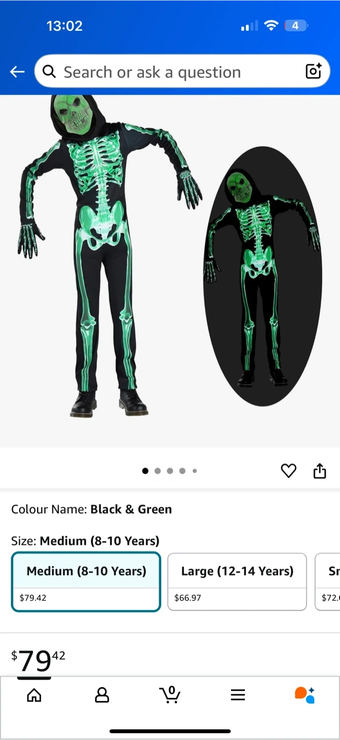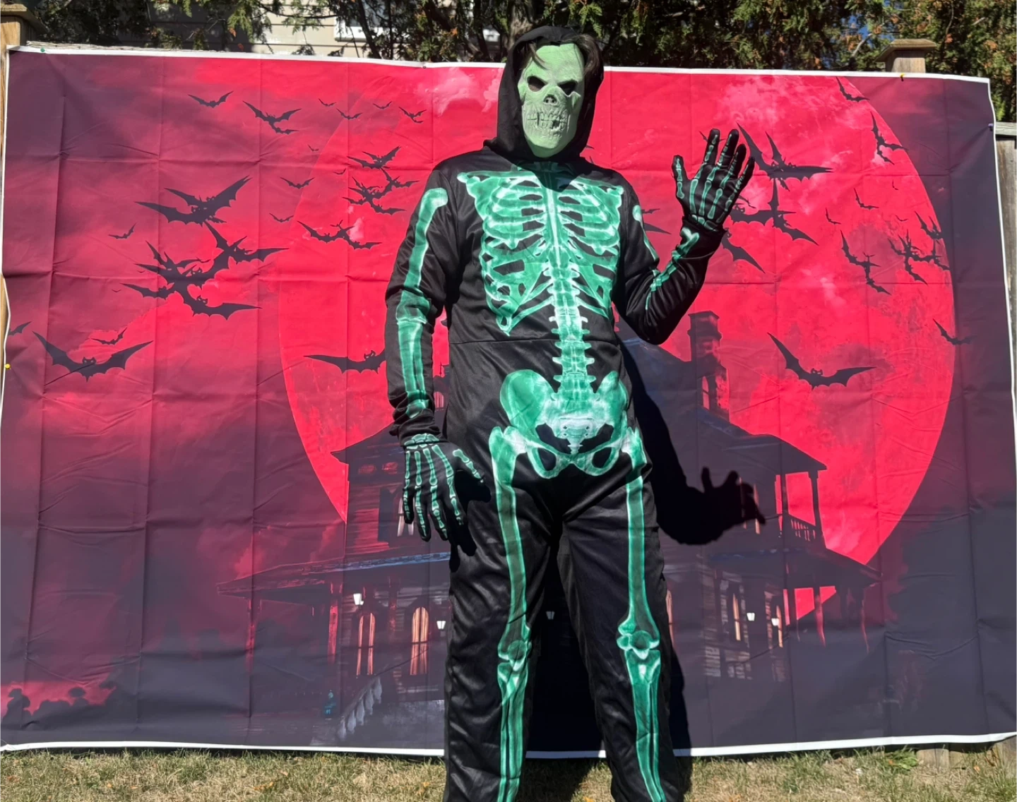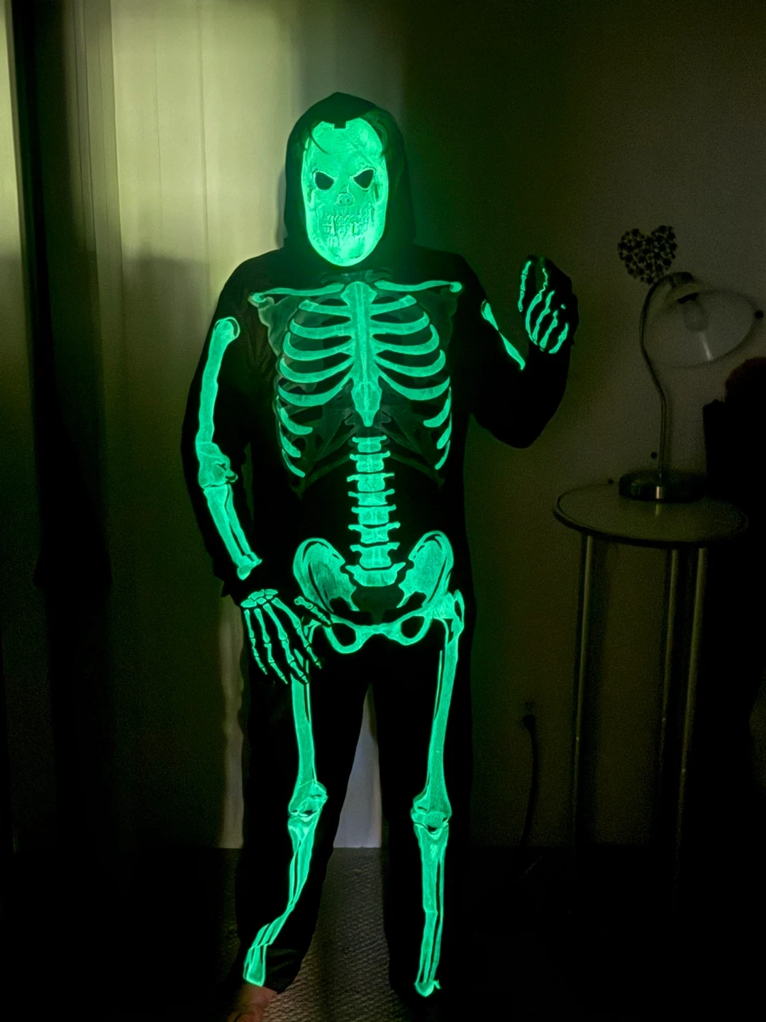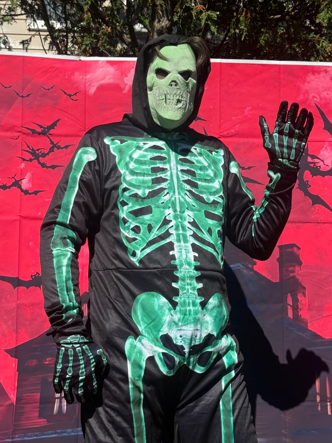 Get ready for Halloween with this cool skeleton costume! It's a size medium, perfect for kids aged up to 12 years. (Can be Adult)The costume is black and green and even glows in the dark!