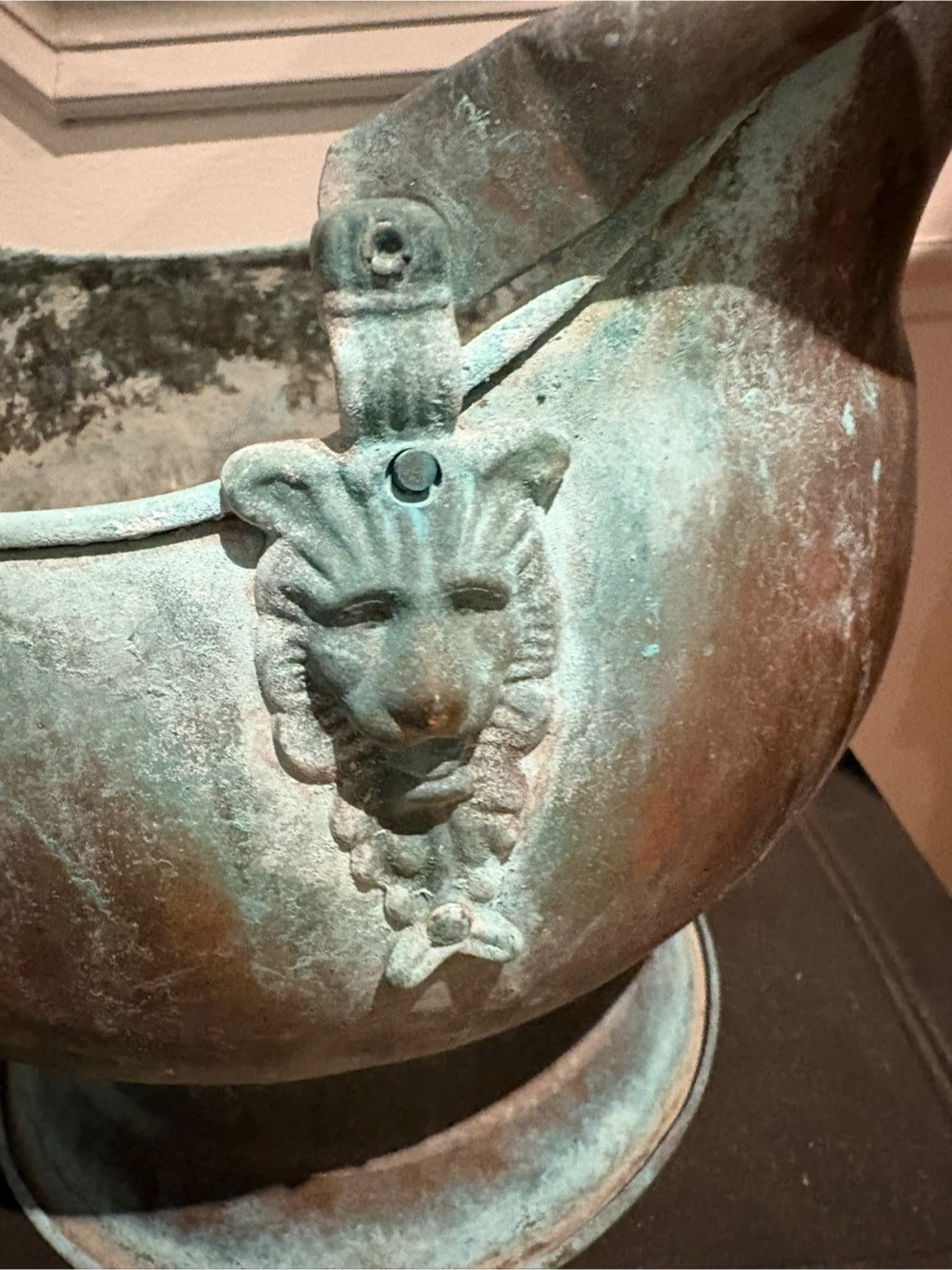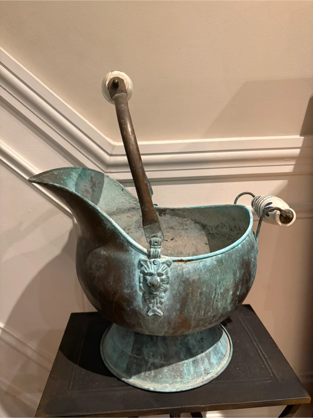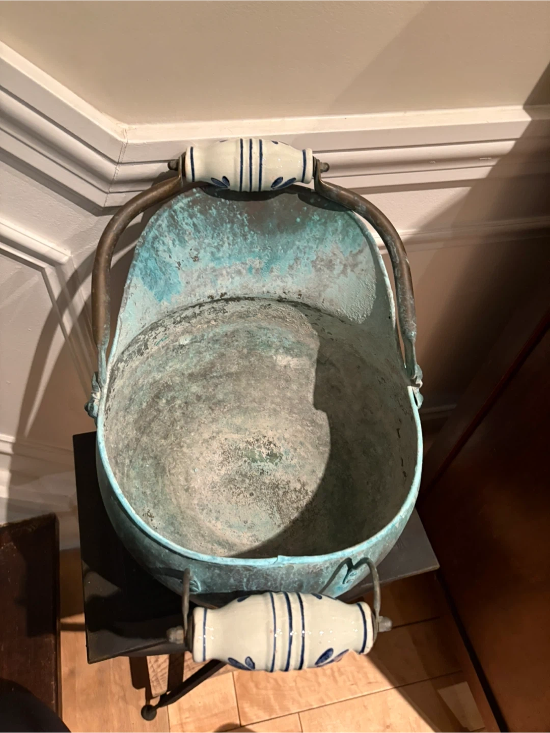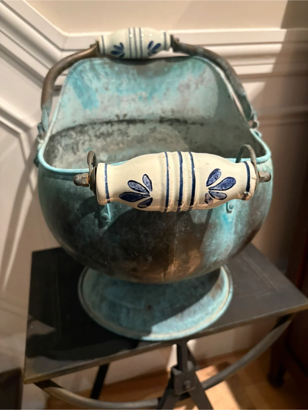 This is a vintage copper coal scuttle, showing beautiful patina and verdigris. It has a decorative ceramic handle with blue stripes and floral accents. It's a sturdy piece with a classic design, perfect for holding firewood or as a decorative accent!