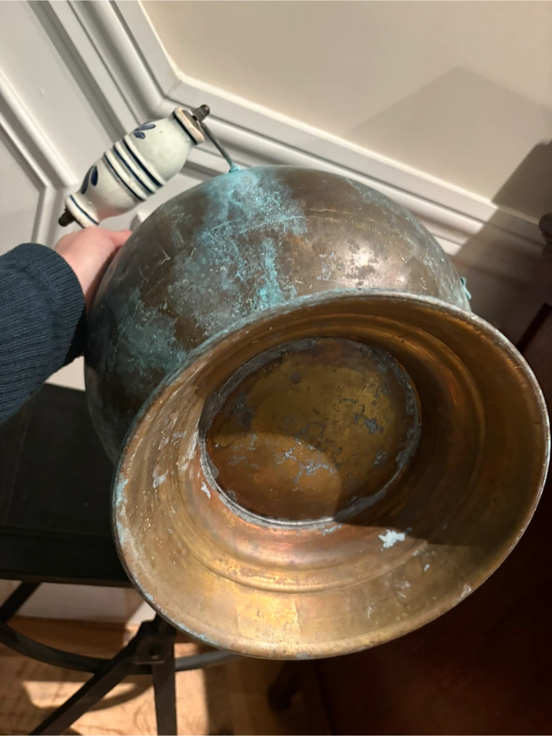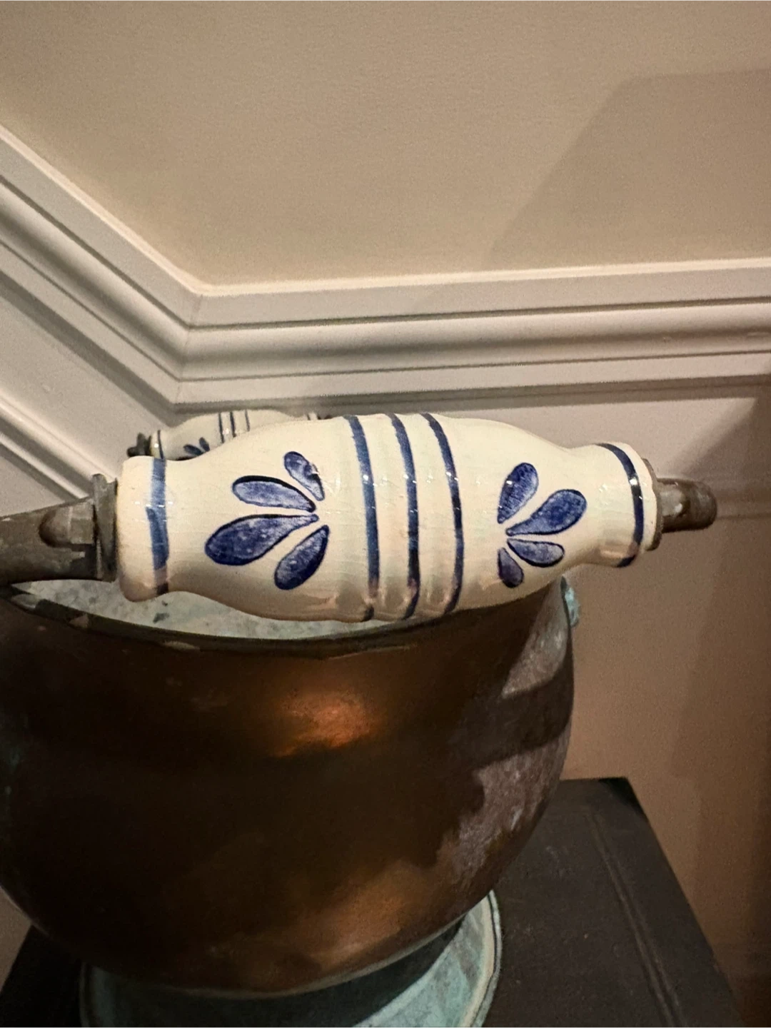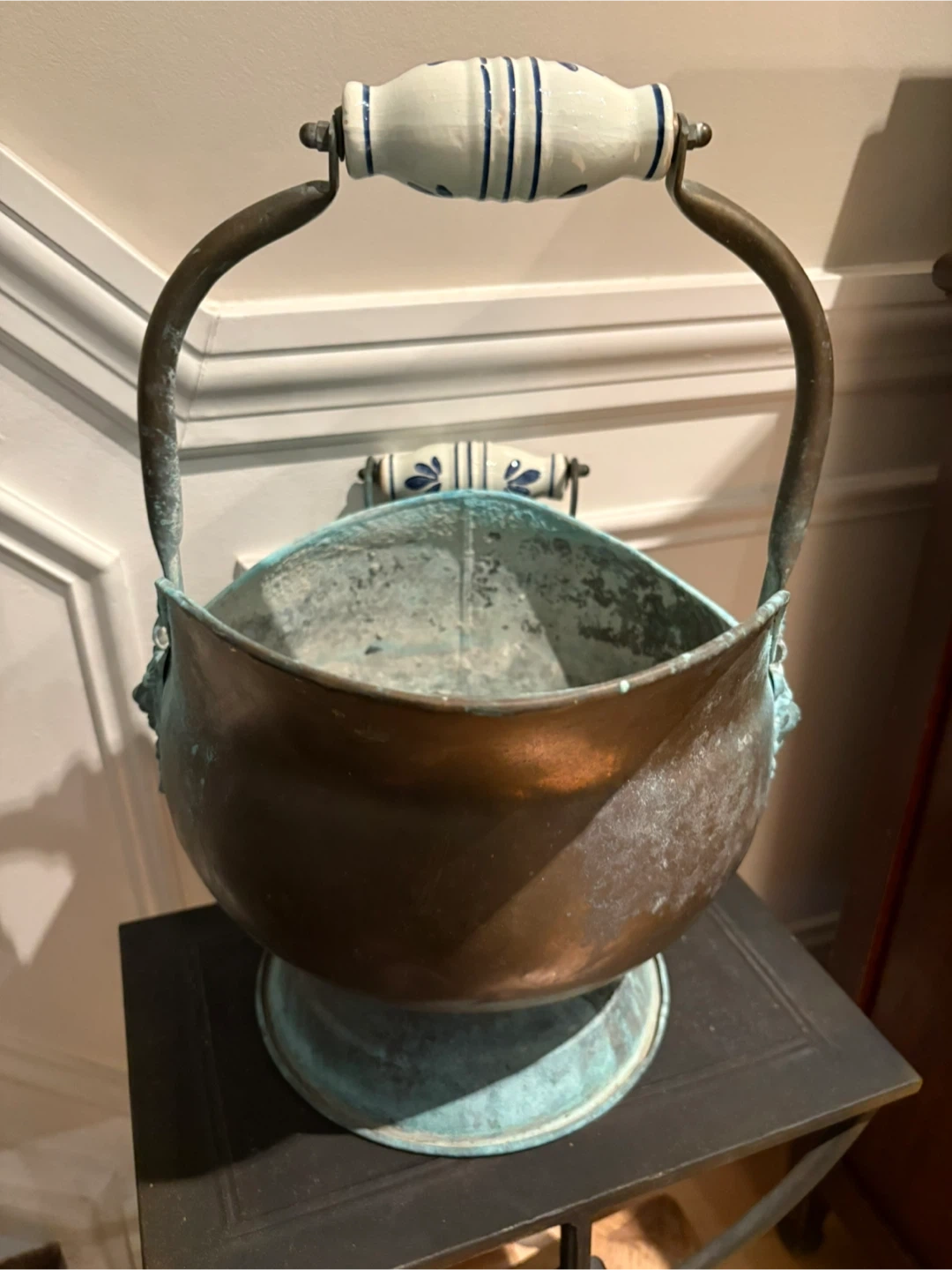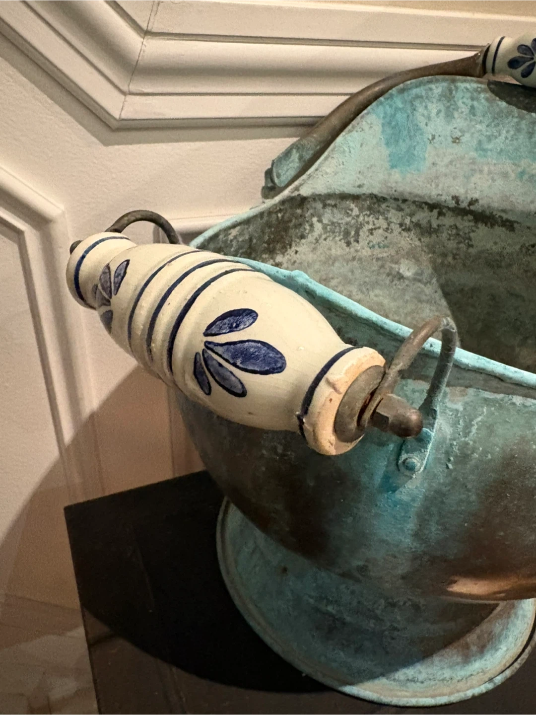 This is a vintage copper coal scuttle, showing beautiful patina and verdigris. It has a decorative ceramic handle with blue stripes and floral accents. It's a sturdy piece with a classic design, perfect for holding firewood or as a decorative accent!