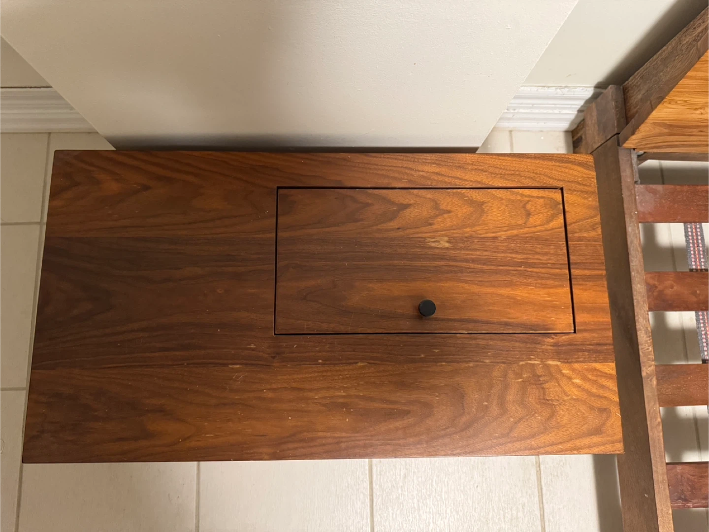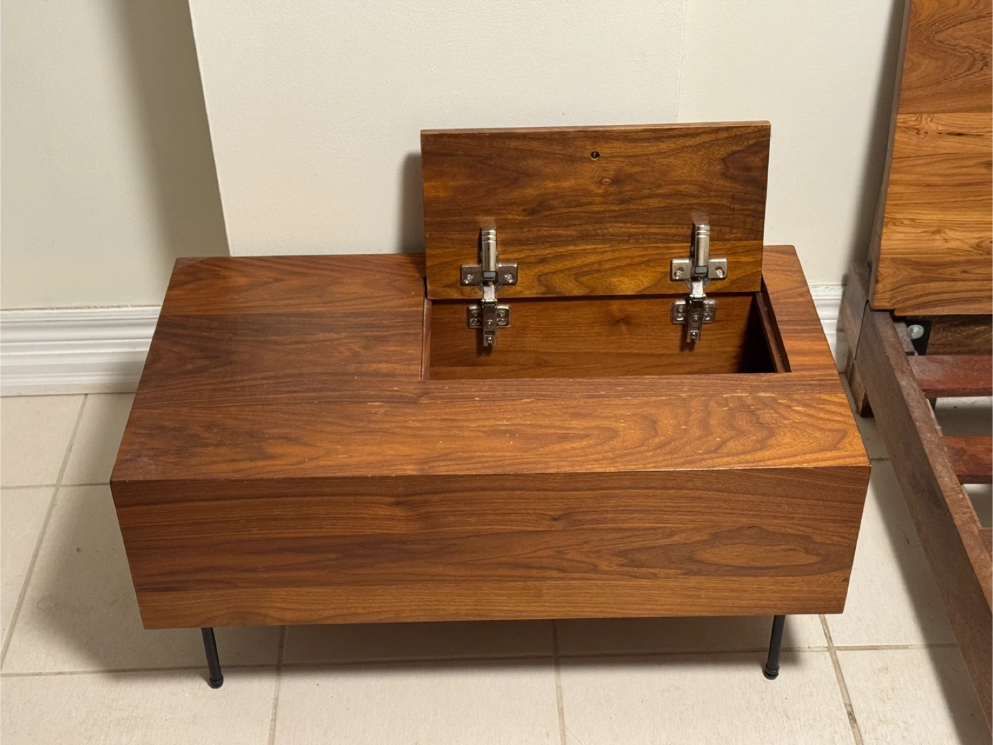 This is a mid-century modern style walnut coffee table designed by West Elm in collaboration with Commune. It has a lift-top compartment for stowing items. Made of walnut wood with black metal legs.