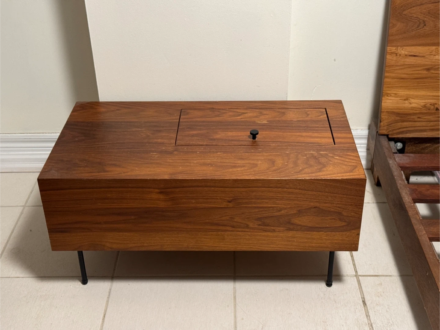 This is a mid-century modern style walnut coffee table designed by West Elm in collaboration with Commune. It has a lift-top compartment for stowing items. Made of walnut wood with black metal legs.