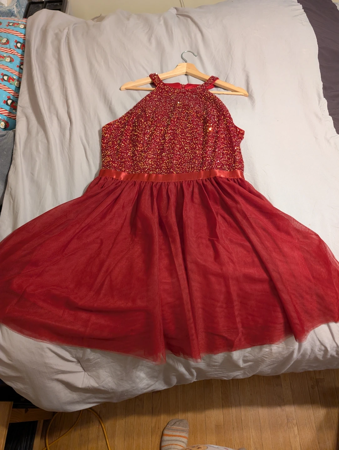 Sparkly red halter neck dress with a sequined bodice and a full tulle skirt. It's perfect for parties or special occasions. The dress has a comfortable fit with a defined waist.