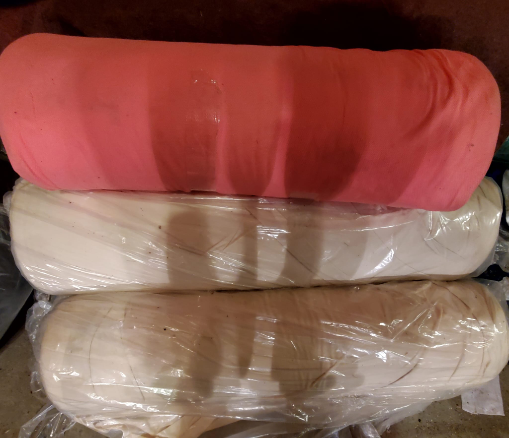 1 large roll of red fabric, pink, burgundy (upholstery large width), and 4 rolls of cream white cloth. Prefer to sell as one lot.
