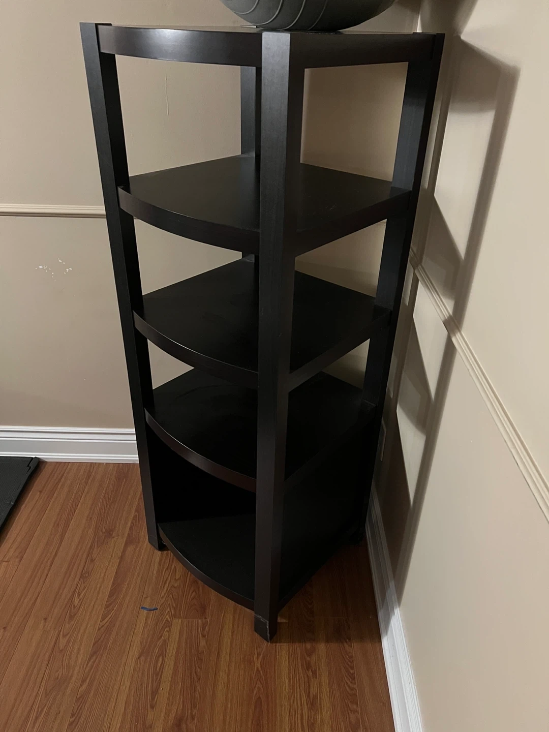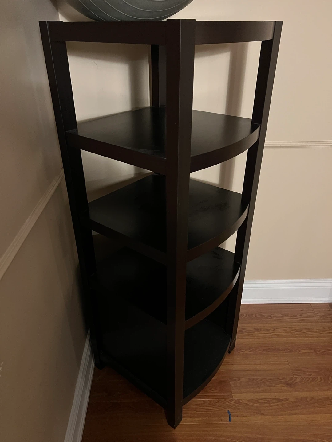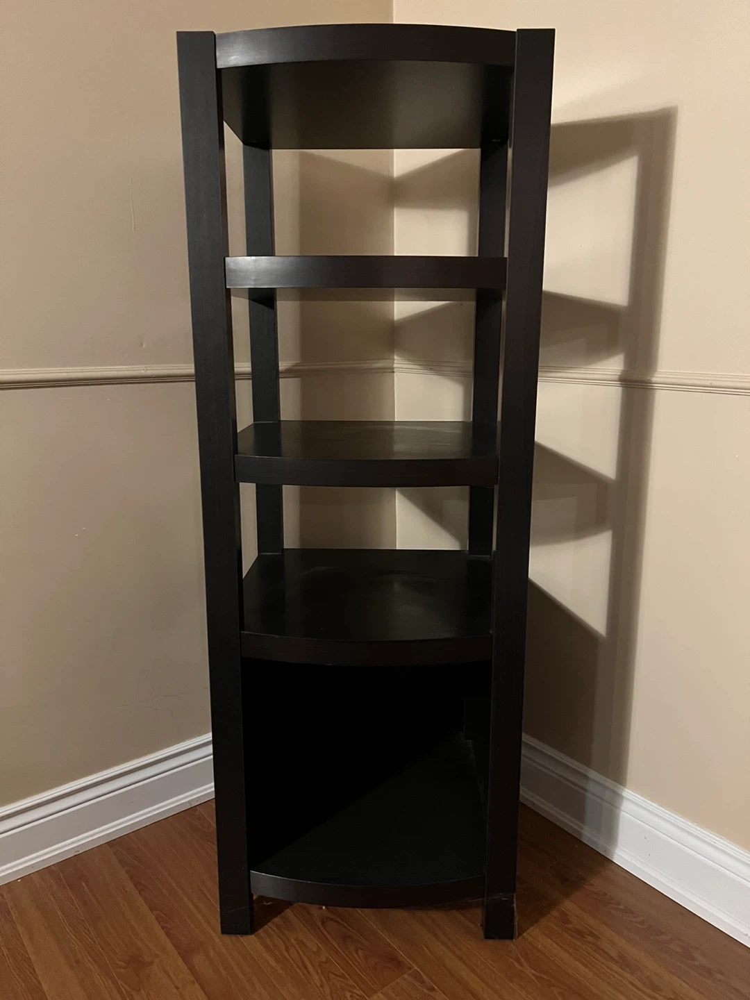 This dark brown corner bookshelf offers five tiers of storage. It's made from wood composite material. Great for organizing books or display items!