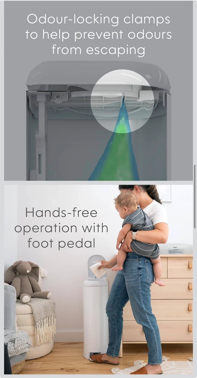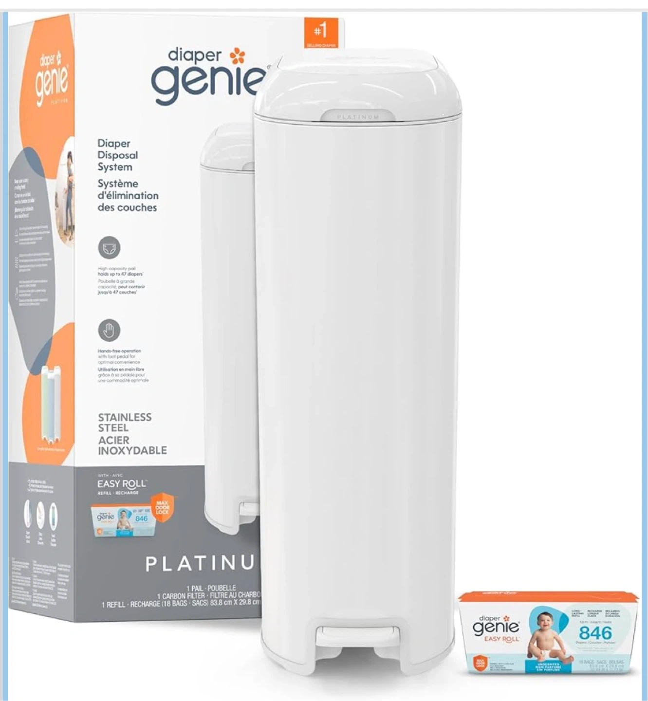 This Diaper Genie Platinum offers a stainless steel design for odour-locking clamps and hands-free operation with a foot pedal. It's a high-capacity pail that holds up to 47 newborn diapers. This pail is useful for keeping nurseries fresh and tidy.