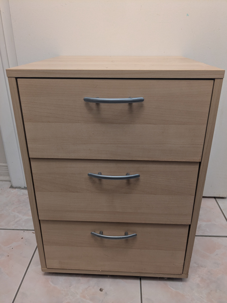16" x 16" x 22.5". In good condition. Minor scuff on the top. Three drawers. Has four small rollers for easy movement.
