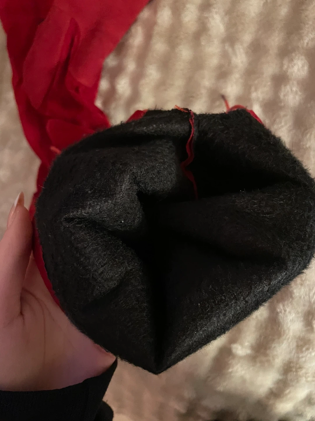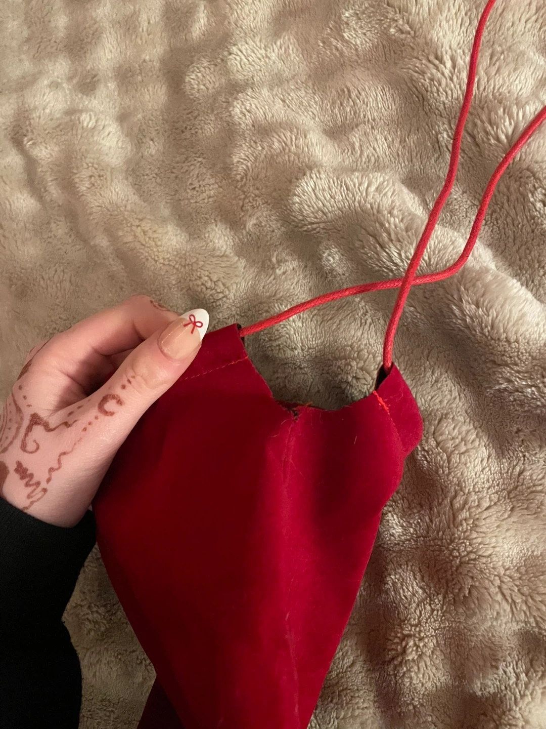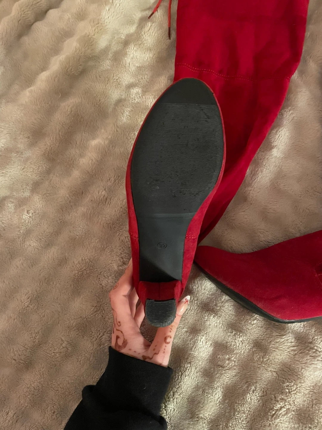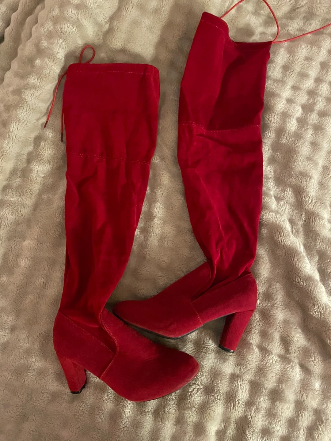 These red over-the-knee boots are a size 39 (Size 8.5 women’s). They're made with a soft, velvet material and feature a comfortable block heel. The inside is lined with black fabric for warmth. Only worn a few times and comfy! They have adjustable strings on the back.