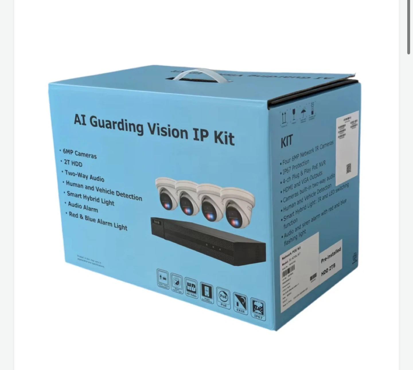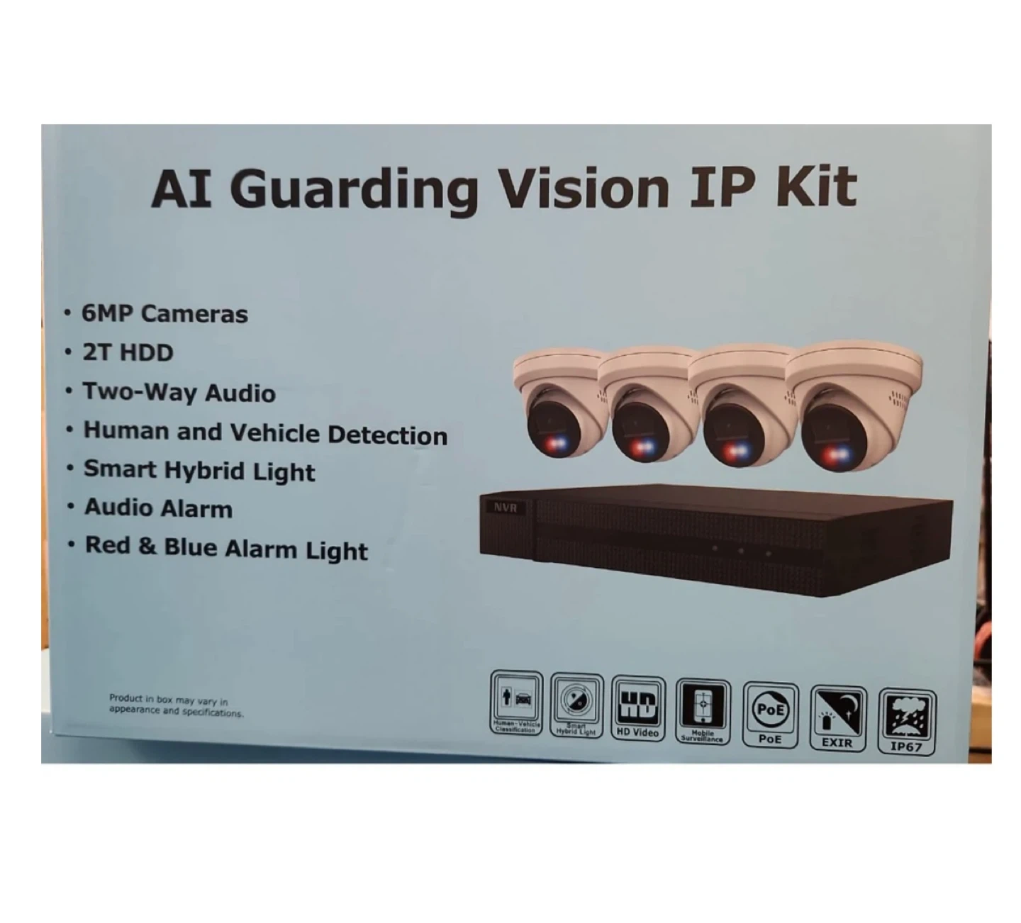 This AI Guarding Vision IP Kit includes 6MP cameras and a 2TB HDD. It offers two-way audio, human and vehicle detection, smart hybrid light, and an audio alarm with a red and blue flashing light. The cameras provide four MP network capability with IP67 protection.