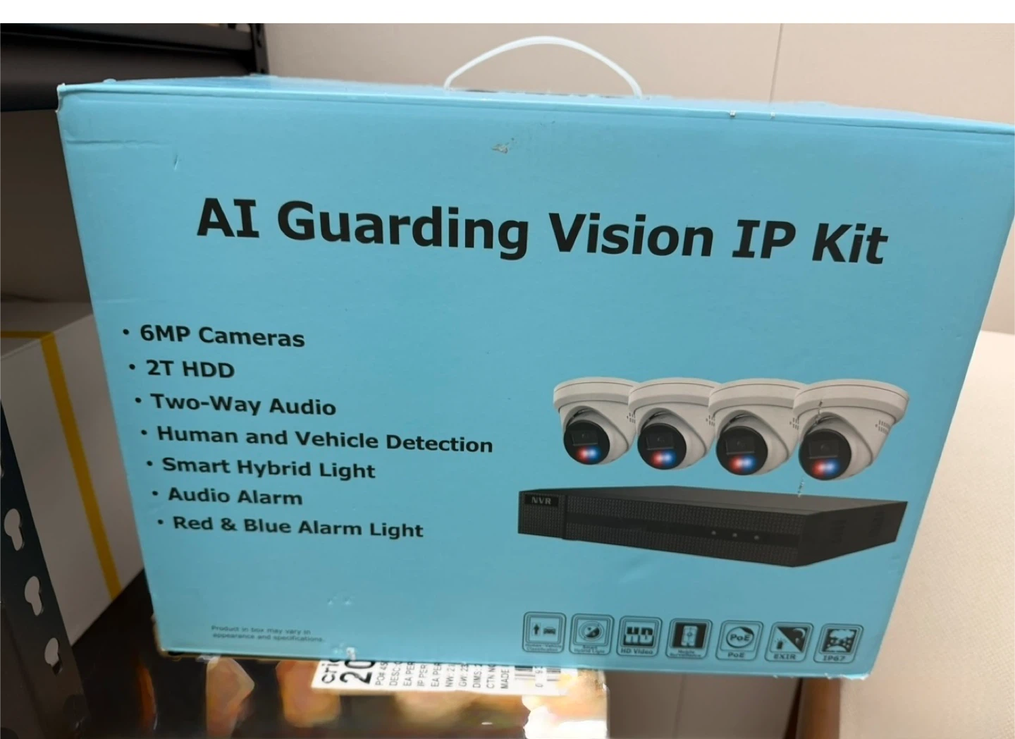 This AI Guarding Vision IP Kit includes 6MP cameras and a 2TB HDD. It offers two-way audio, human and vehicle detection, smart hybrid light, and an audio alarm with a red and blue flashing light. The cameras provide four MP network capability with IP67 protection.