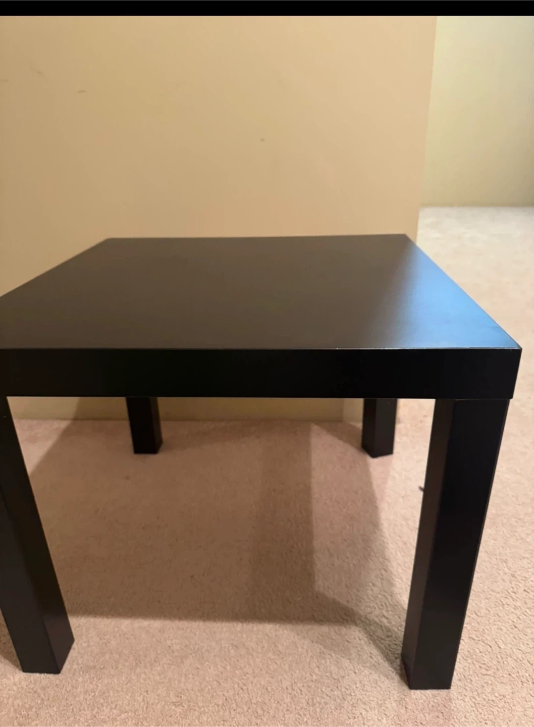 A simple black square side table. It's made of a dark material with four sturdy legs. This table is a handy size for placing next to a couch or chair. From ikea
